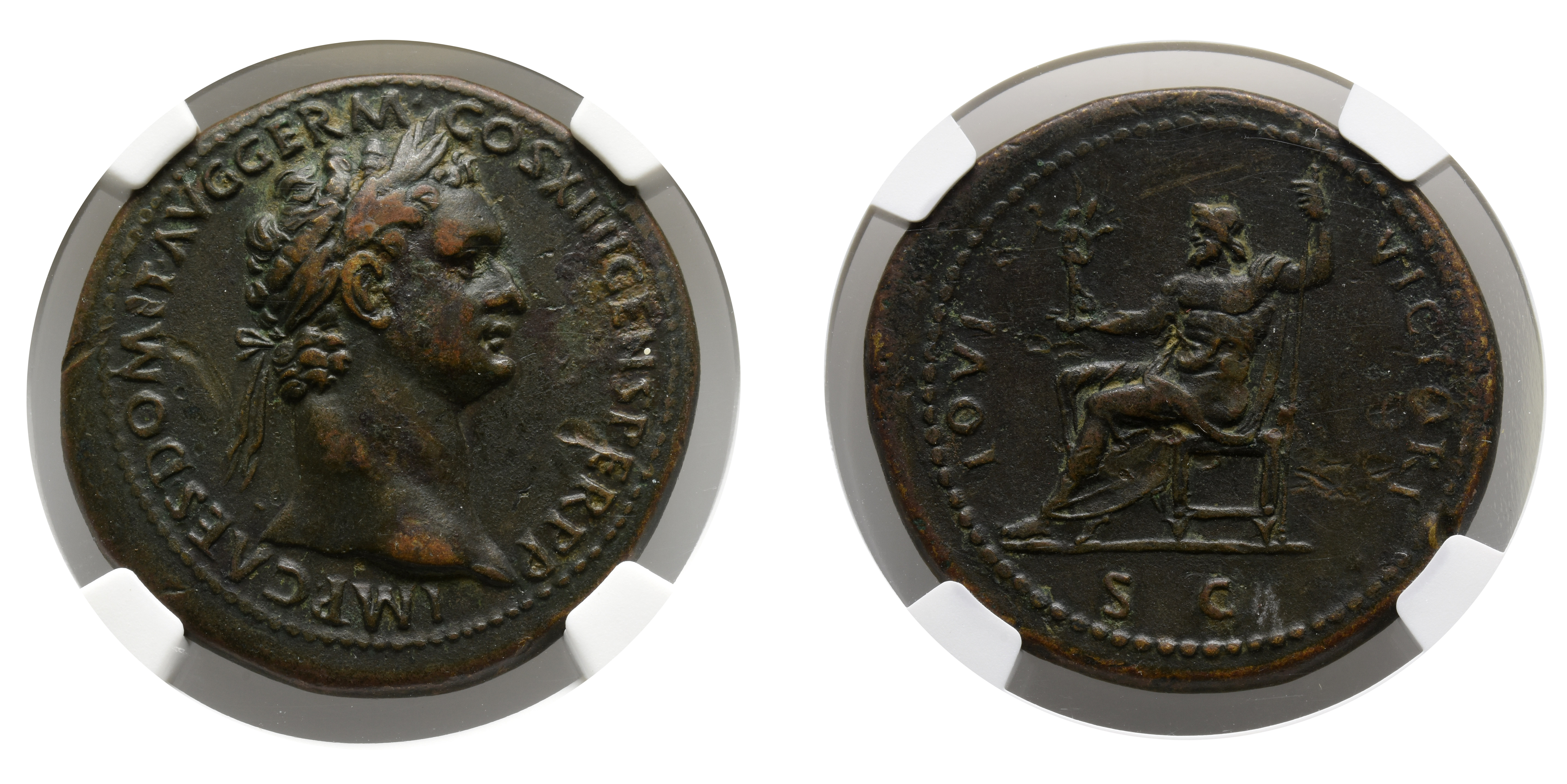 Rome mint. Struck AD 88-89. IMP CAES DOMIT AVG GERM COS XIIII CENS PER P P, laureate head to right / IOVI VICTORI, Jupiter seated left on throne, holding Victory and sceptre; in exergue, S C. RIC II.1 633; Cohen 313; BMC 406; CBN 436. NGC graded Ch VF 5/5 - 3/5, Fine Style, marks (#8221849-004).