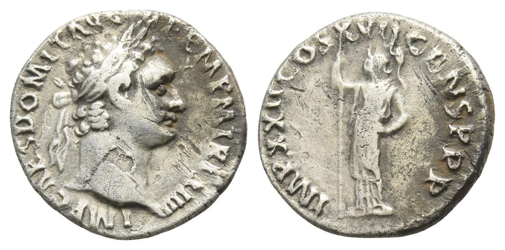 IMP CAES DOMIT AVG GERM P M TR P XIIII, laureate head to right / IMP XXII COS XVII CENS P P P, Minerva standing to left, holding spear. RIC II.1 773; BMCRE 226; RSC 286. 3.08gr, 18mm, 7h.