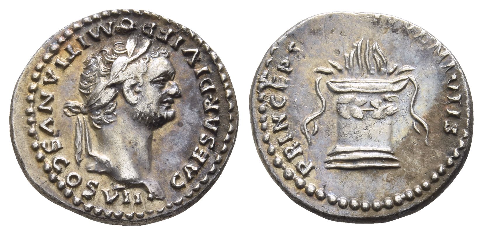 CAESAR • DIVI F DOMITIANVS COS VII •, laureate head to right / PRINCEPS IVVENTVTIS, garlanded and lit altar with horns. RIC II.1 266 (Titus); BMCRE 92-6 (Titus); BN 76-7 (Titus); RSC 397a. 2.81gr, 18mm, 5h.