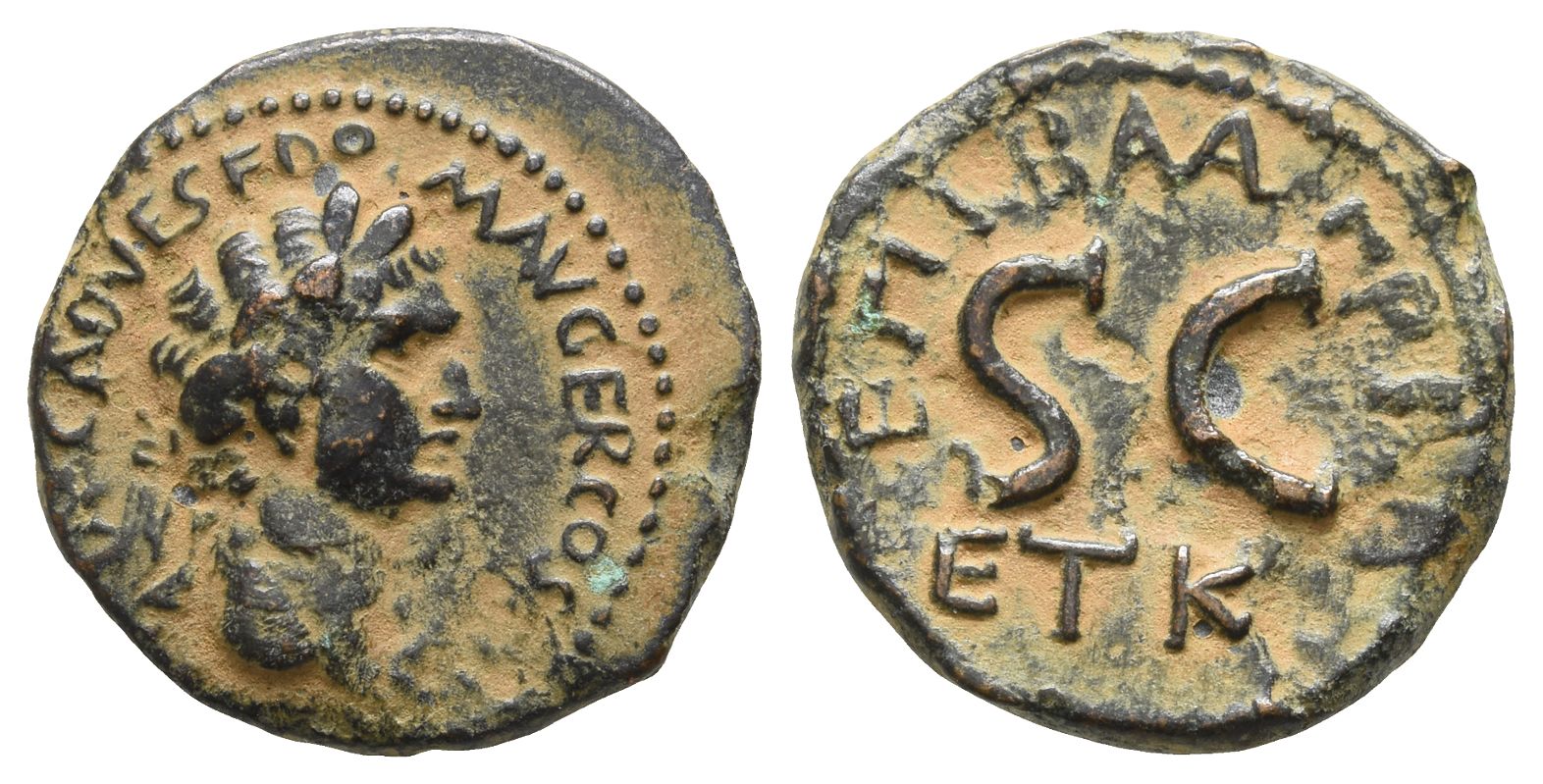 IMP CA D VES F DOM AVG GER COS XII, laureate head to right, wearing aegis / ΕΠΙ ΒΑ ΑΓΡΙ, large S C, ET KϚ (date) in exergue. RPC II 2272; Meshorer 36; Sofaer 223; TJC 164; Hendin GBC 6 6356; Hendin GBC 5 1326. 4.95gr, 20mm, 6h.