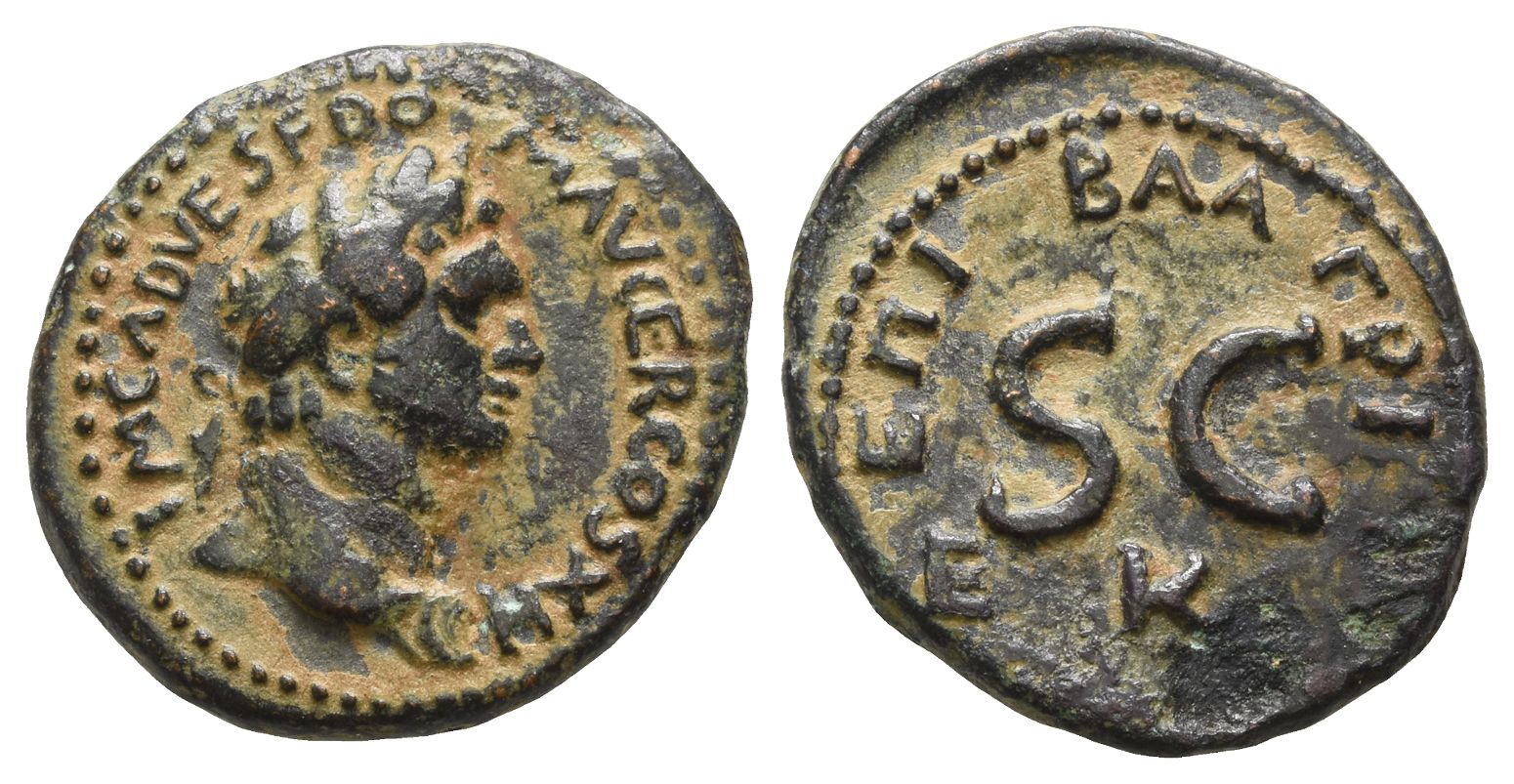 IMP CA D VES F DOM AVG GER COS XII, laureate head to right, wearing aegis / ΕΠΙ ΒΑ ΑΓΡΙ, large S C, ET KϚ (date) in exergue. RPC II 2272; Meshorer 36; Sofaer 223; TJC 164; Hendin GBC 6 6356; Hendin GBC 5 1326. 4.80gr, 20mm, 6h.