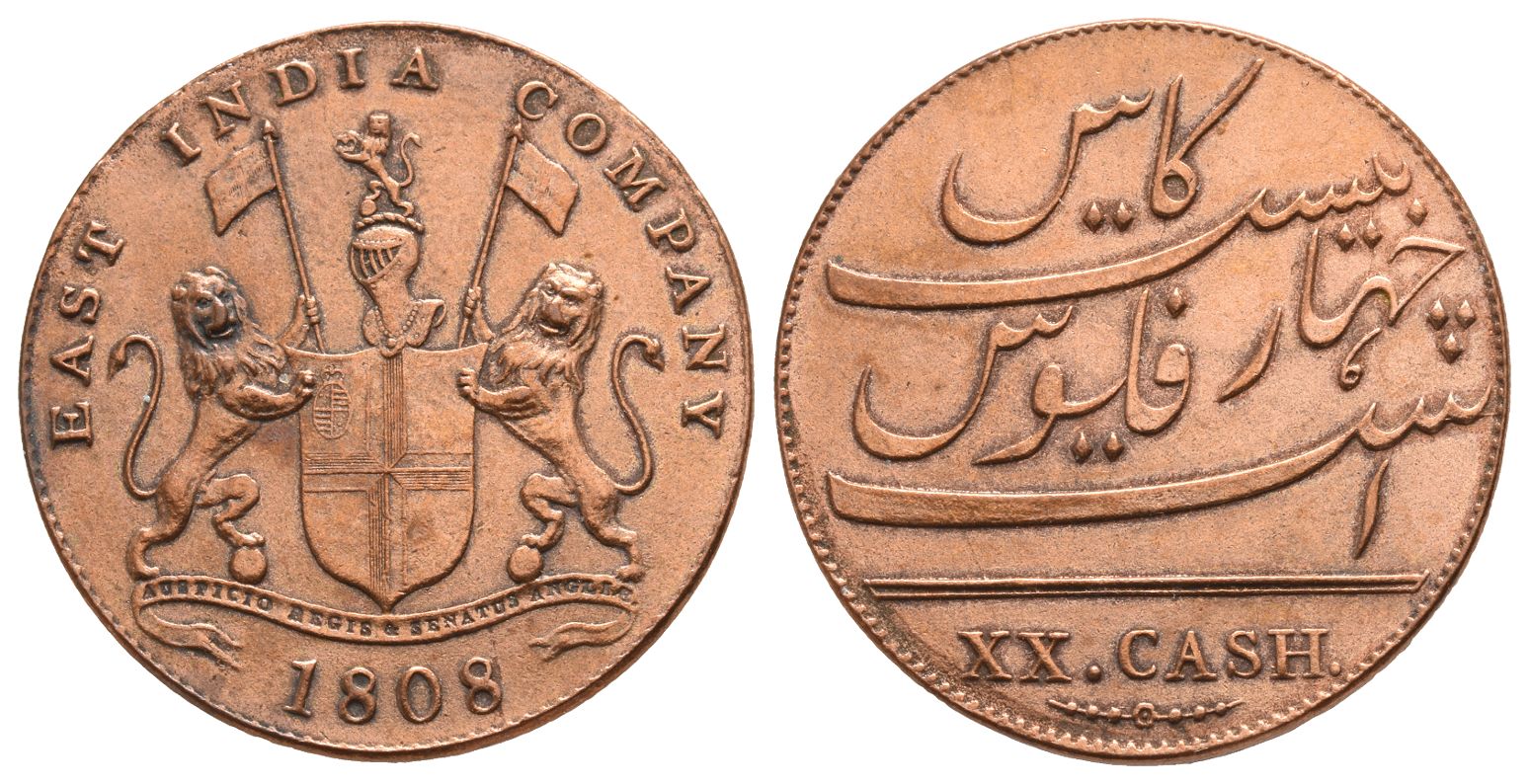 EAST INDIA COMPANY, arms of the East India Company, date below / Persian legend, XX.CASH. in exergue. Stevens 5.122; Pridmore 198; KM 321. 9.06gr, 31mm, 6h.