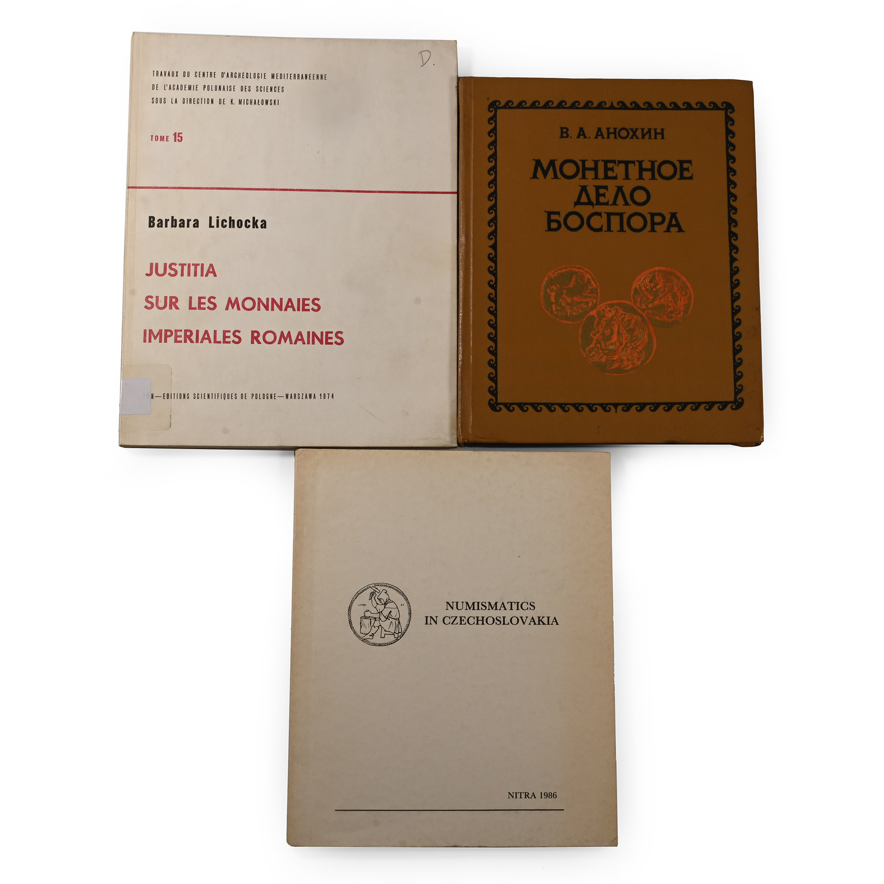 J. Sejbal & E. Kolníková (eds) - Numismatics in Czechoslovakia - Nitra, 1986, 120pp, cardcovers; B. Lichocka - Justitia sur les Monnaies Impériales Romaines - Warsaw, 1974, 124 pp, card covers,monochrome text figures; B.A. AHOXИH - MOHETOE ДEЛO БOCПOPA - Kiev, 1986, 179 pp, hardback with cloth covers, monochrome plates 1 kg total, 22 x 17.7 - 25 x 19.2 cm