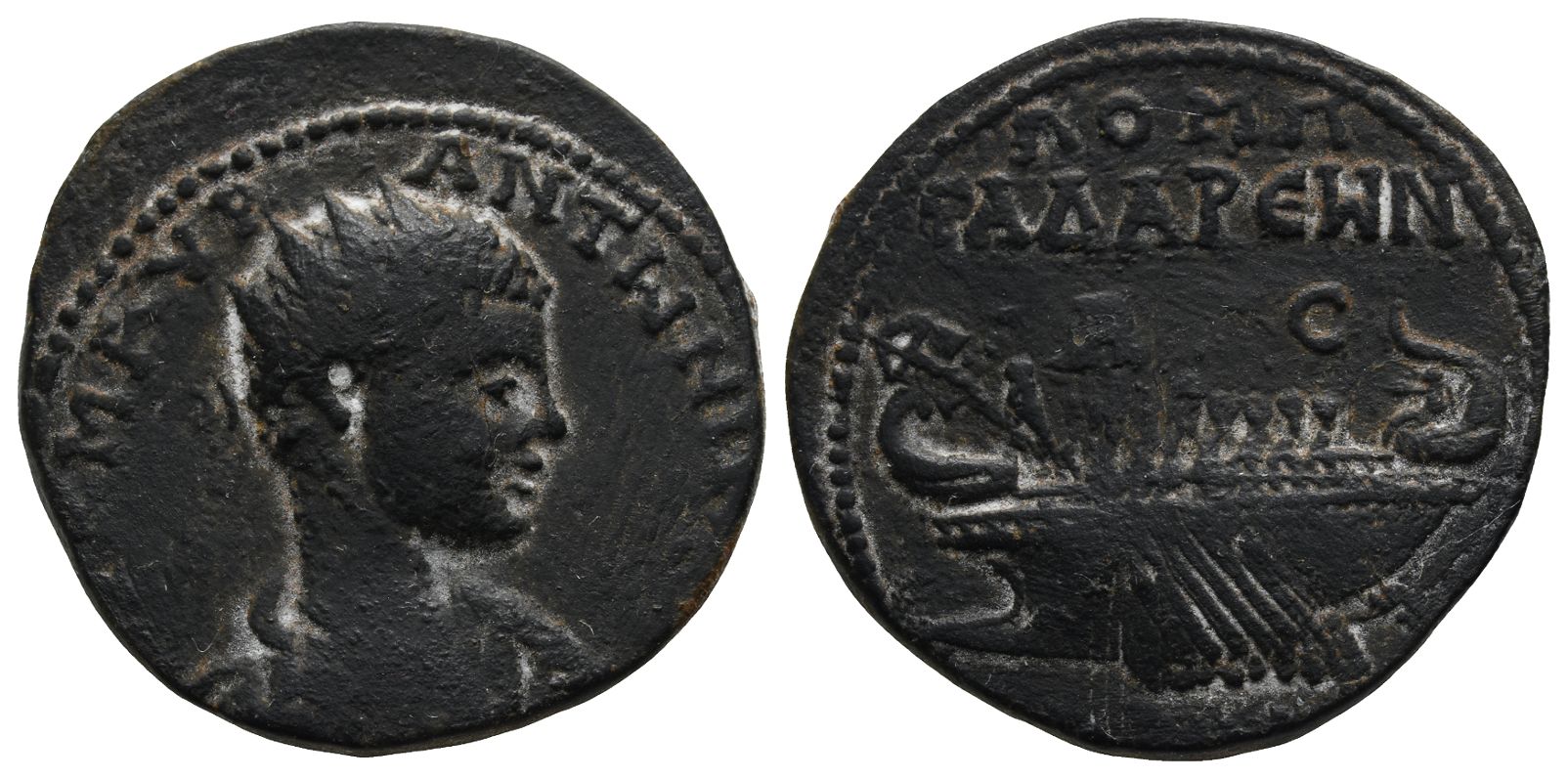 [ΑΥΤ] Κ Μ ΑΥΡ ΑΝΤWΝΙΝ[ΟϹ], radiate, draped, and cuirassed bust to right, seen from front / ΠΟΜΠ ΓΑΔΑΡΕWΝ A[Π]C (date), galley to left with rowers; at stern, navigator; at prow, figure standing and holding standard. RPC VI Online 9255; Spijkerman 85; Rosenberger 79; Sofaer 91. 16.87gr, 32mm, 12h.