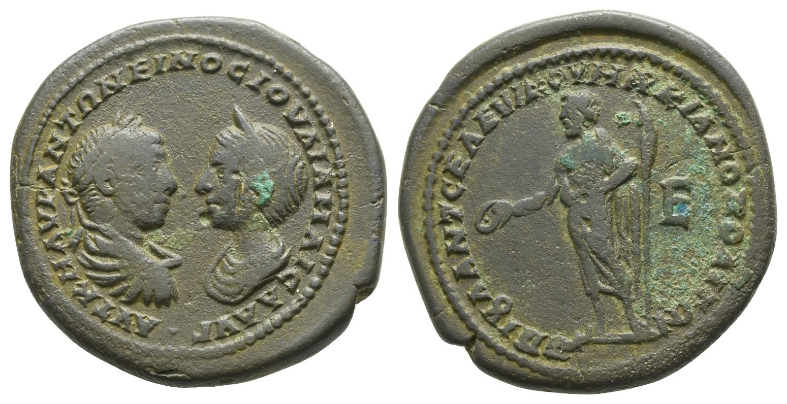 ΑΥΤ Κ Μ ΑΥΡ ΑΝΤΩΝΕΙΝΟϹ ΙΟΥΛΙΑ ΜΑΙϹΑ ΑΥΓ, confronted busts of Elagabalus to right, laureate, draped and cuirassed, and Julia Maesa to left, draped and wearing stephane / ΥΠ ΙƔΛ ΑΝΤ ϹΕΛΕΥΚΟΥ ΜΑΡΚΙΑΝΟΠΟΛΙΤΩΝ (AP and ΩN ligate), Zeus standing to left, holding patera and sceptre; E (mark of value) to right. RPC VI, 1442 (temporary); AMNG 935-6; Hristova & Jekov, Marcianopolis 6.28.1.1-3. 15.49gr, 30mm, 12h.