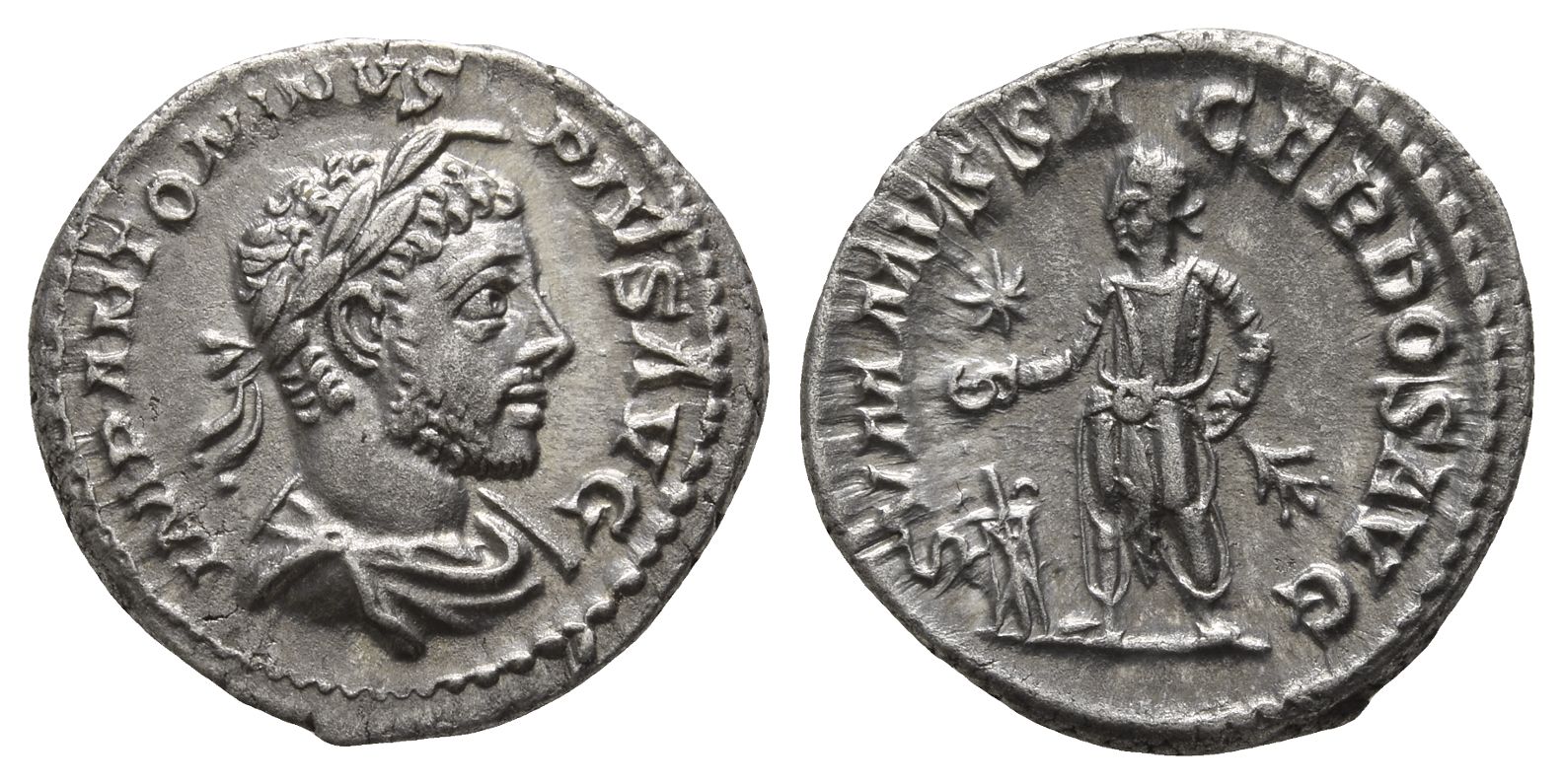 Rome mint; struck AD 221-222. IMP ANTONINVS PIVS AVG, laureate, horned and draped bust to right / SVMMVS SACERDOS AVG, emperor standing to left sacrificing over tripod and holding cypress branch; star in left field. RIC 146; BMC 232; RSC 276. 3.02gr, 19mm, 1h