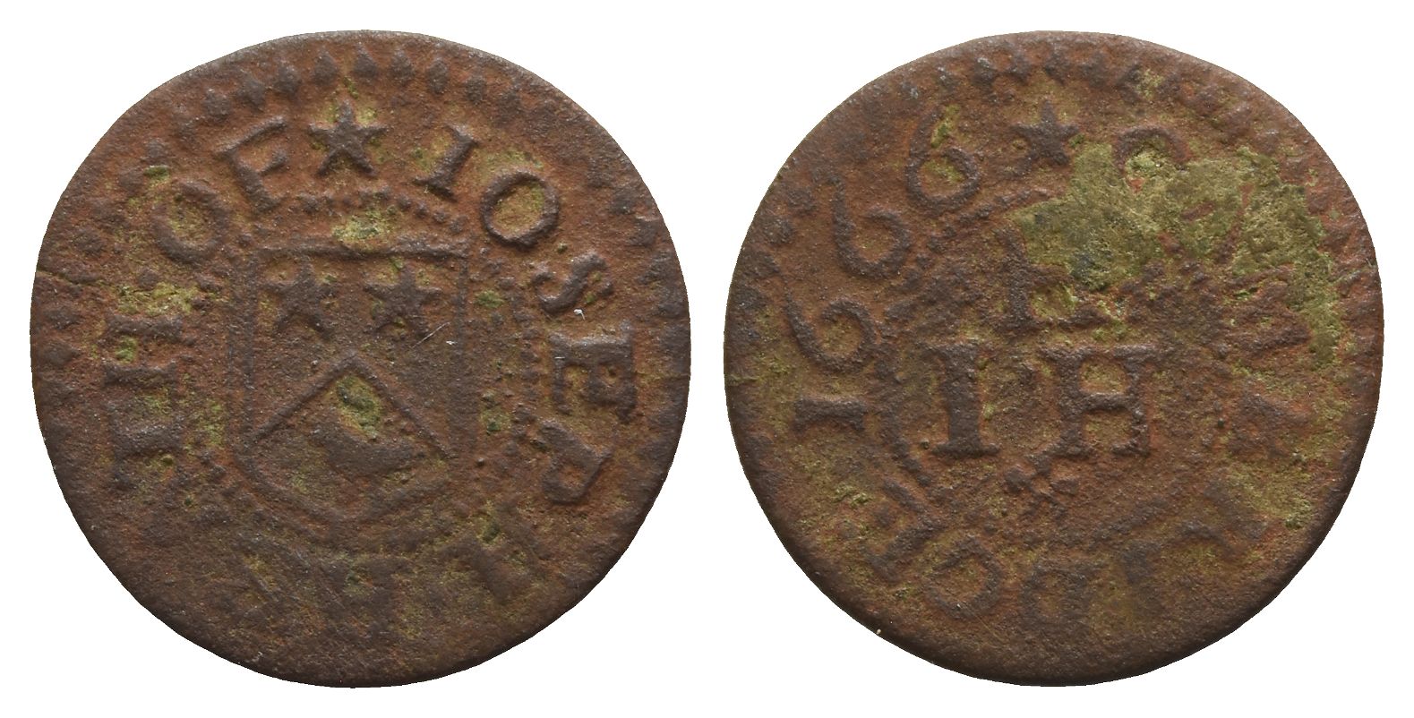 ★ IOSEPH • HEATH • OF, shield of arms / ★ CAMBRIDGE • 1666, H I • H in three lines, stars in fields. Dickinson 52. 1.26gr, 16mm, 12h.