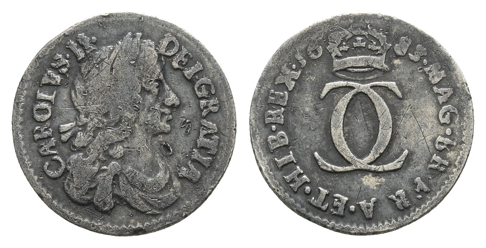 Design by John Roetier. CAROLVS·II· DEI·GRATIA, laureate and draped bust to right / MAG·BR·FRA·ET·HIB·REX CC, crown above interlinked C's; date above. SCBC 3388; KM# 429. 0.95gr, 14mm, 6h