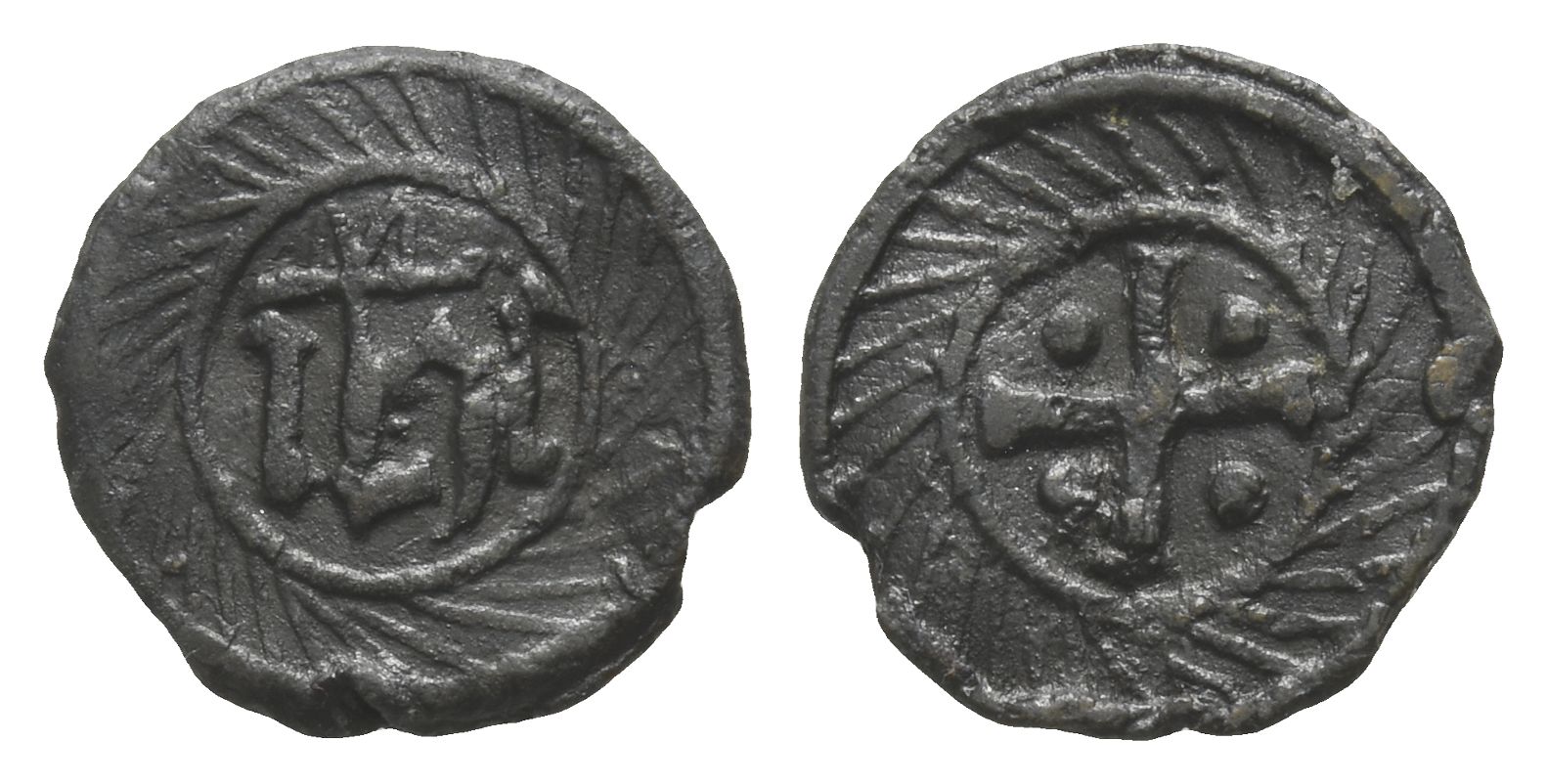 London or Paris mint. Mitchiner Type Mb. IHC in Gothic within anti-clockwise ray border / Cross with dot in each angle; all within anti-clockwise ray border. Mitchiner & Skinner type M, 50 var. (clockwise ray border). 0.69gr, 12mm.