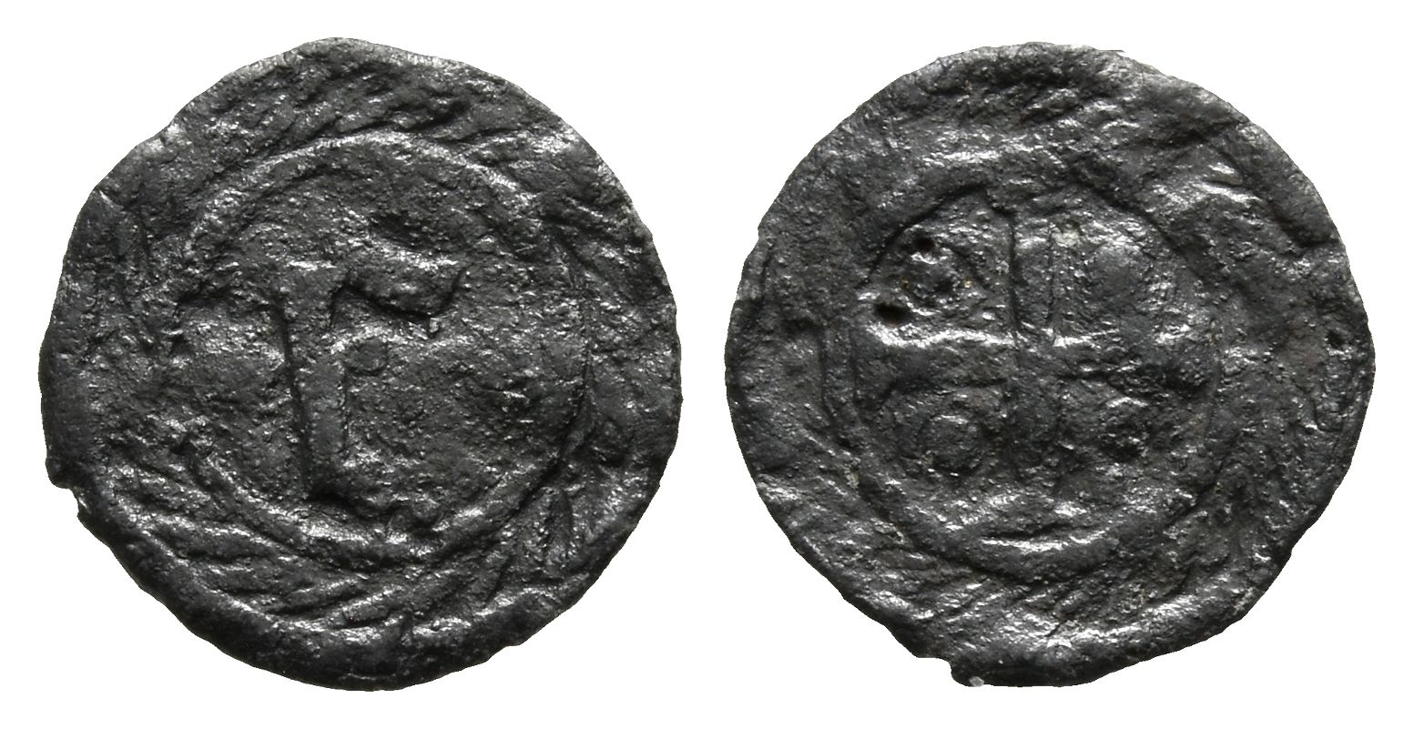 London or Paris mint. Mitchiner Type Ma. Large E in Gothic within clockwise ray border / Cross with dot-in-circle in each angle and expanded arms; al within clockwise ray border. Mitchiner & Skinner type M, 2. 0.62gr, 12mm.