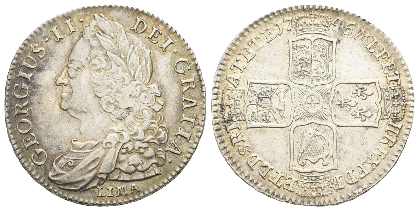 Back to previous pageEngland. Hanover, George II AR Halfcrown. Dated 1745 LIMA and RY 19. London mint.