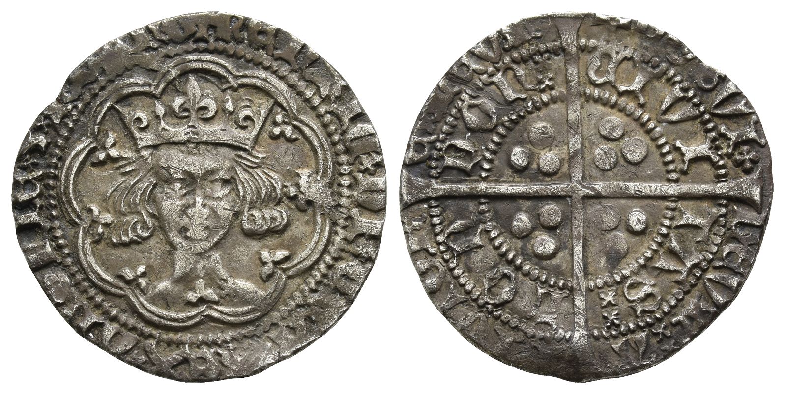 London mint; i.m: pierced cross. Class C. ⧾ ҺЄNRIC × DI × GRA RЄX × ANGLIЄ × Z × FRANC, crowned facing bust within double polylobe, fleurs at cusps; mullet on right shoulder / (Pierced cross) POSVI ✤ DЄVᙏ ×× A-DIVTOR-Є × ᙏЄVᙏ and CIVI-TAS ×× LON-DON ××, long cross pattée with trefoil of pellets in each quarter. North 1387; SCBC 1764. 3.76gr, 24mm, 12h.