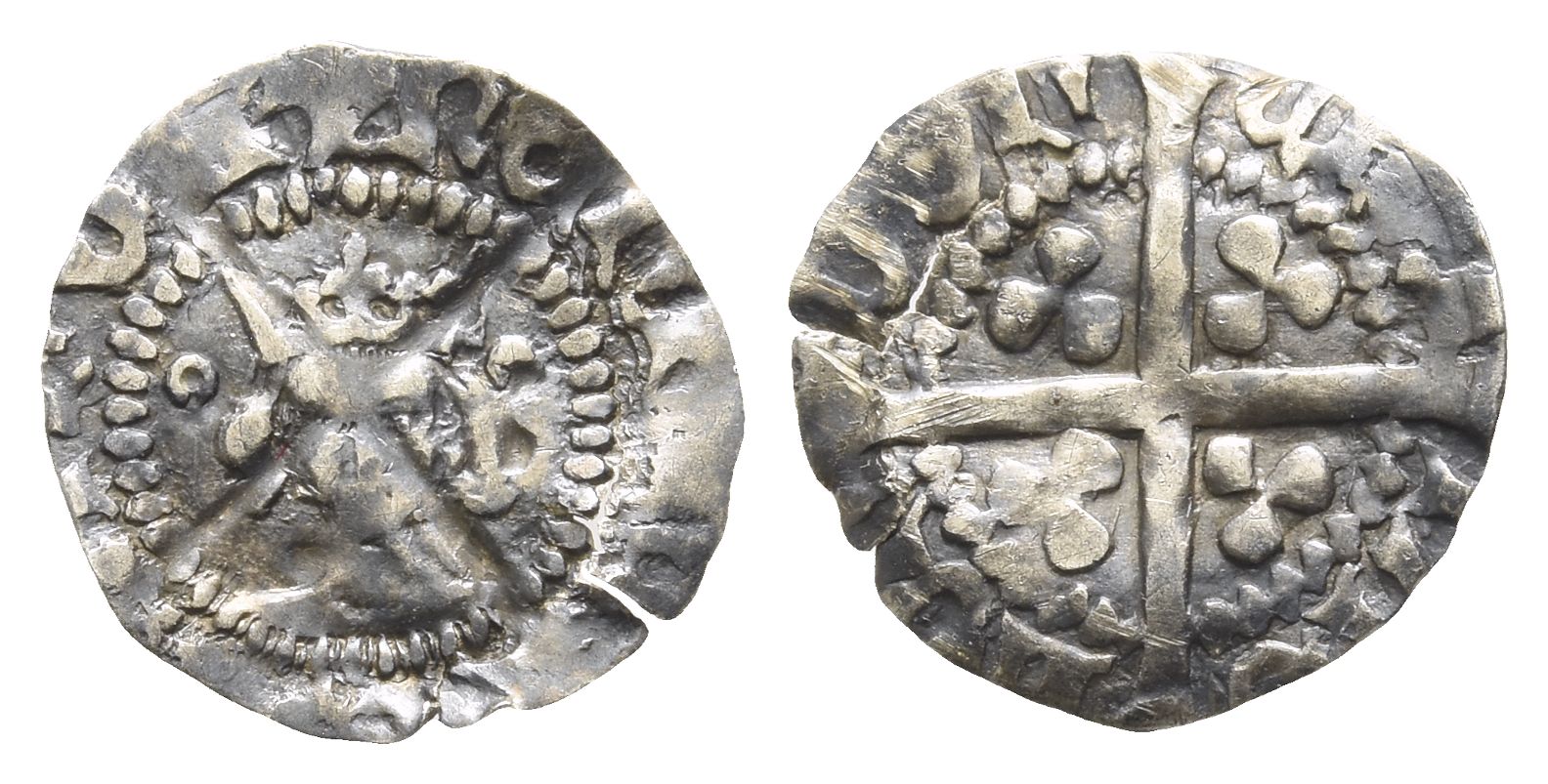 (Pierced cross with pellet centre) ҺЄꞂRIC RЄX AꞂGL, crowned facing bust, broken annulets by hair / CIVI-TAS LOꞂ-DOꞂ, long cross pattée; trefoils in angles. North 1410, SCBC 1795. 0.36gr, 13mm, 10h.