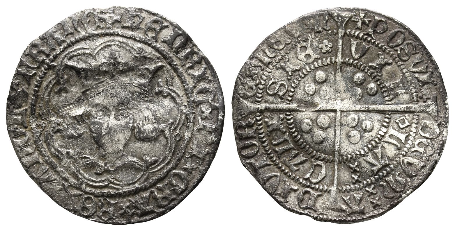 Calais mint; i.m: cross II/V. Rosette-mascle issue; struck 1427-1430. (Cross) ҺЄNRIC x DI x GRA' x RЄX x ANGL Z FRANC, facing crowned bust / (Cross) POSVI (rosette) DЄVᙏ xx A-DIVTOR-Є ᙏЄVᙏ and VIL-(mascle) LA xx CALI-SIЄ (rosette), long cross pattée with three pellets in each angle. North 1446; SCBC 1859. 3.39gr, 26mm, 6h.