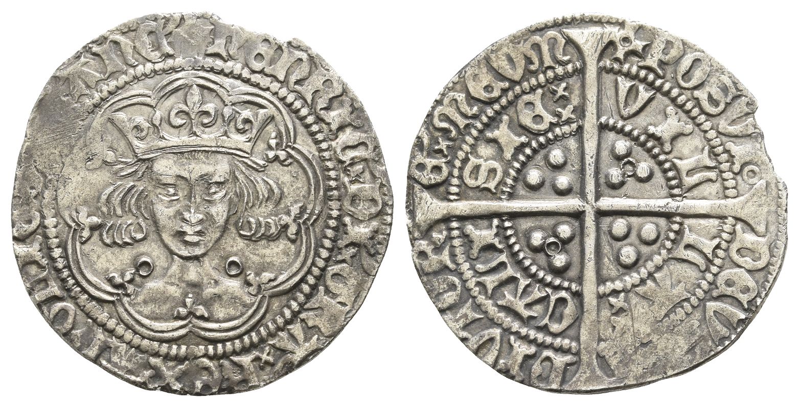 (Pierced cross) ҺЄNRIC ' ˣ DI ' ˣ GRA ' ˣ RЄX ˣ ANGLIЄ ˣ S ˣ FRANC', crowned facing bust within tressure of arches; trefoils at cusps, annulets flanking neck / (Pierced cross) POSVI ◦ DЄVᙏ ˣˣ A-VDIVTOR-Є 'ˣ ᙏЄVᙏ and VIL-LA ˣˣ CALI-SIЄ ˣˣ, long cross pattée; triple pellets in quarters, additional annulets in second and third quarters. North 1427; SCBC 1836. 3.66gr, 26mm, 9h.