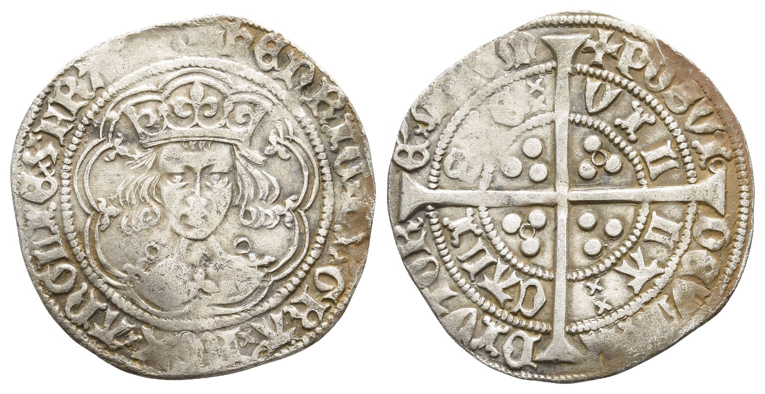 (Pierced cross) ҺЄNRIC 'ˣ DI 'ˣ GRA 'ˣ RЄX ˣ ANGLIЄ ˣ Z ˣ FRA[...], crowned facing bust within tressure of arches; trefoils at cusps, annulets flanking neck / (Pierced cross) POSVI ◦ DЄVᙏ ˣˣ A-DIVTOR-Є 'ˣ ᙏЄVᙏ and VIL-LA ˣˣ CALI-SIЄ ˣˣ, long cross pattée; triple pellets in quarters, additional annulets in second and third quarters. North 1427; SCBC 1836. 3.72gr, 27mm, 8h.
