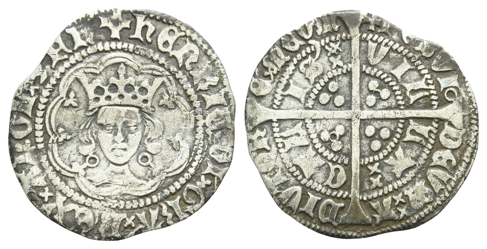 Calais mint; i.m: incurved pierced cross/plain cross. Annulet issue, struck 1422-1430. (Incurved pierced cross) ҺЄNRIC '× DI '× GRA '× RЄX ANGL '× Z × FR, crowned facing bust within double polylobe, fleurs at cusps; annulets flanking neck / (Plain cross) POSVI ◦ DЄVᙏ ×× A-DIVTOR-Є ×× ᙏЄVᙏ and VIL-LA ×× CAL-IS '××, long cross fourchée; triple pellets in quarters; additional annulet in second and third quarter. Cf. North 1429 (i.m); SCBC 1840. 1.68gr, 22mm.