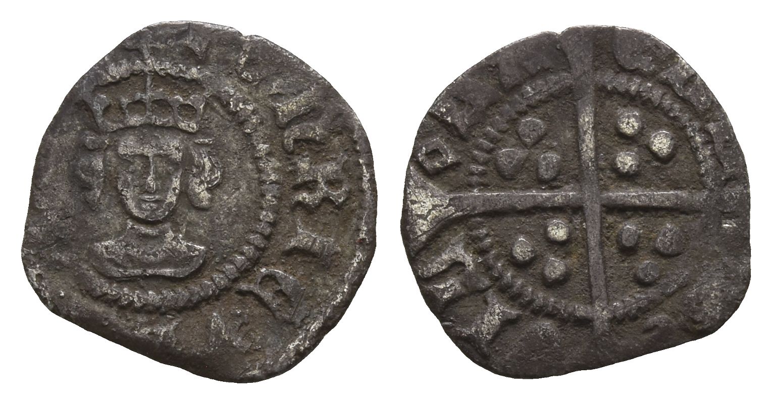 Calais mint; i.m: uncertain. Pinecone Mascle(?) issue. ҺЄNRICVS [...],crowned facing bust / VIL-◊LA CAL-[...], long cross pattée; triple pellets in quarters. Cf. North 1469; cf. SCBC 1885. 0.55gr, 13mm, 6h.