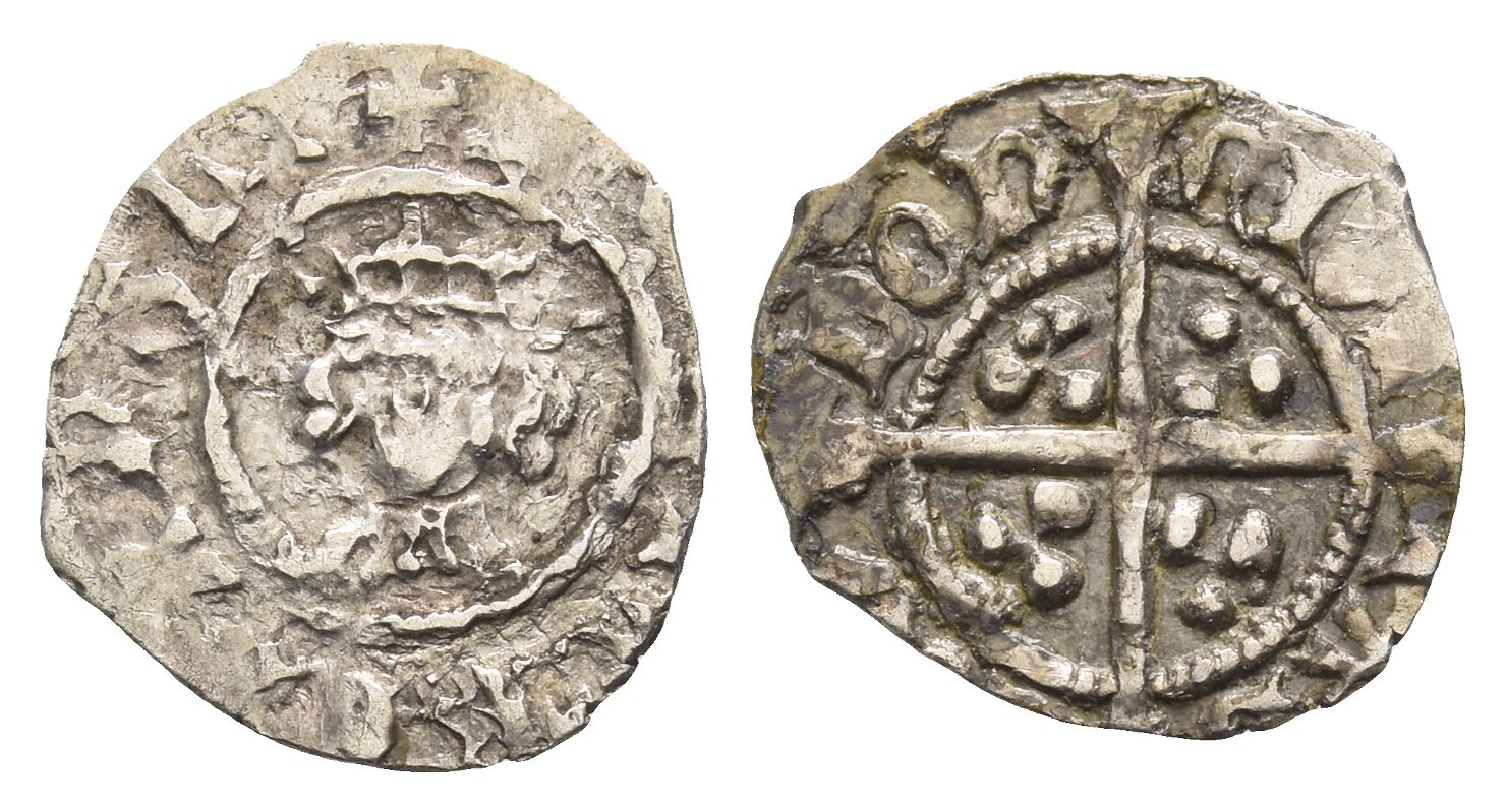 (Cross fleurée?) ꞂЄn ˣ RIC RЄX ˣ AnGLI ˣ, crowned facing bust; pellets flanking crown, leaf on breast / CIVI-TAS LOn-DOn, long cross pattée; triple pellets in quarters; additional pellet at fourth quarter. Cf. Withers III PL.12/e; North 1512; SCBC 1928. 0.49gr, 14mm, 2h.
