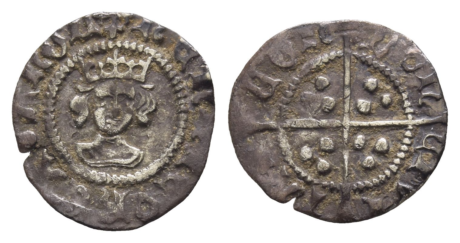 (Cross fleury) + hЄꞂRIC (mascle) RЄX (pinecone) AꞂGL, crowned facing bust / CIVI-TAS LOꞂ-DOꞂ, long cross pattée; trefoils in quarters. North 1468; SCBC 1884. 0.46gr, 13mm, 12h.