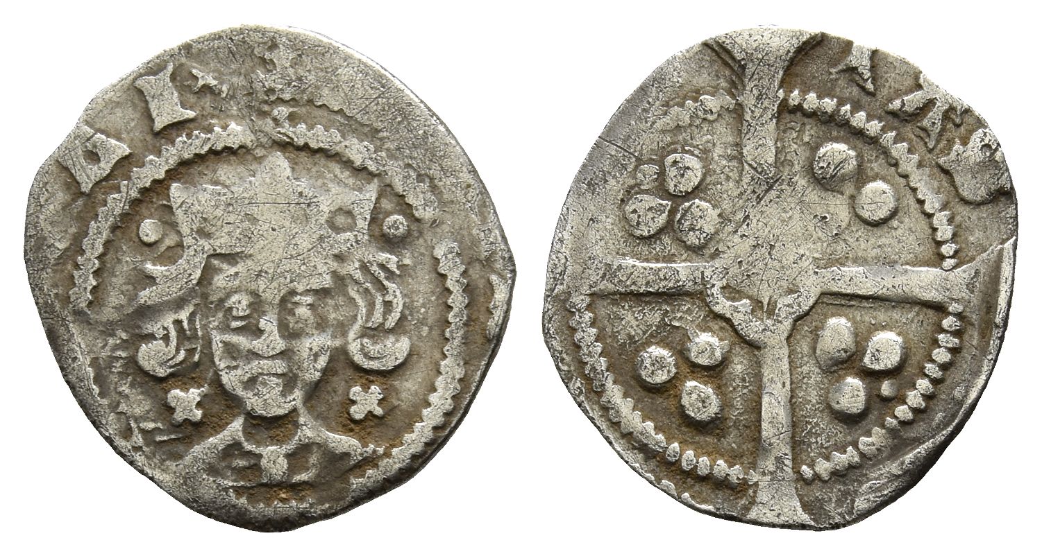 York mint; i.m: cross-crosslet. Leaf-pellet issue. William Booth, archbishop. Struck 1454-1461. (Cross-crosslet) [...]LI ˣ, crowned bust facing; saltires flanking neck, pellets flanking crown; leaf on breast / [...]TAS [...], long cross pattée with small cross within voided quatrefoil at centre; triple pellets in quarters; additional pellet in second and third quarters. North 1521; SCBC 1940. 0.88gr, 16mm, 9h.