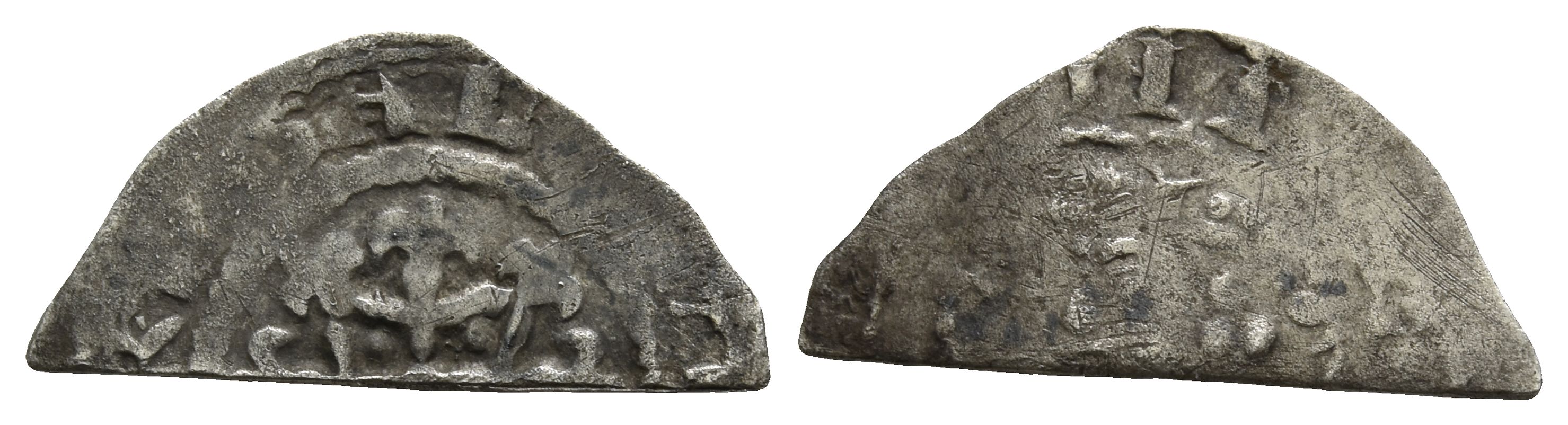 Uncertain mint and moneyer. Struck 1125 - circa 1135. Quadrilateral on cross fleury type. [ҺЄ]NR[ICVS], crowned and diademed bust facing three-quarters to left, holding sceptre in right hand / Illegible inscription, quadrilateral with incurved sides and lis at every angle over cross fleury. North 871; SCBC 1276. 0.65gr, 21mm.