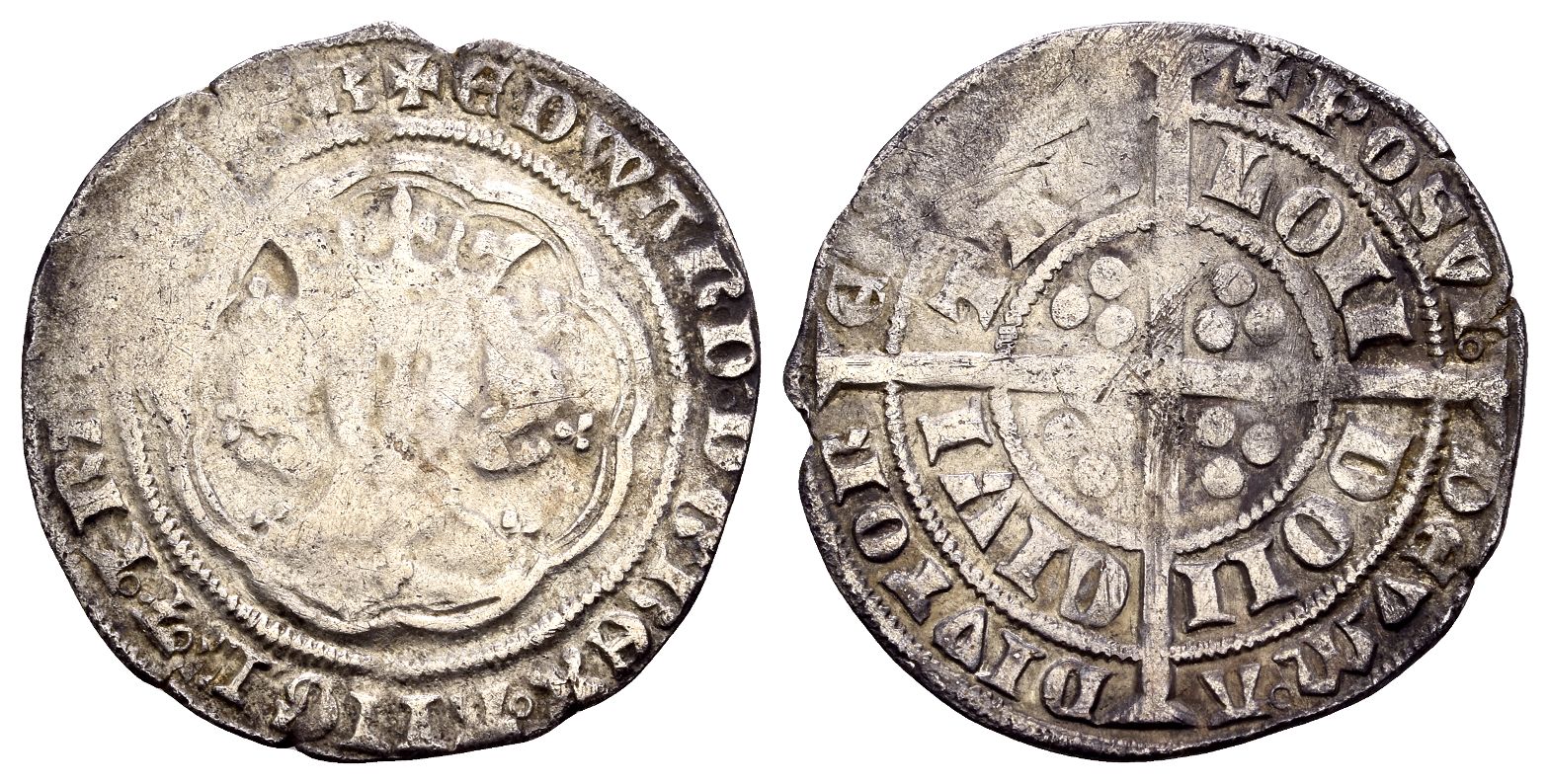 England. Plantagenet, Edward III AR Groat. Struck 1354-1355. London (Tower) mint; i.m: cross 3. Fourth coinage. Pre-treaty period, series E.