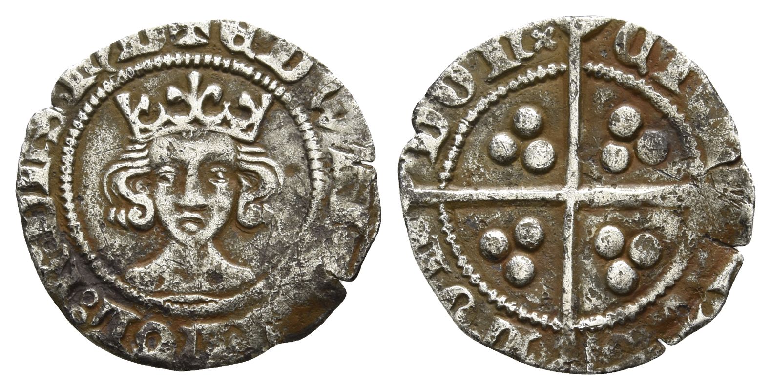 Treaty period, 1361-1369. French title omitted. +EDWARD AnGL R DnS HYB around crowned bust facing / CIVI TAS LOn DOn x, long cross with three pellets in each angle. North 1265; SCBC 1624. 1.01gr, 17mm, 10h.