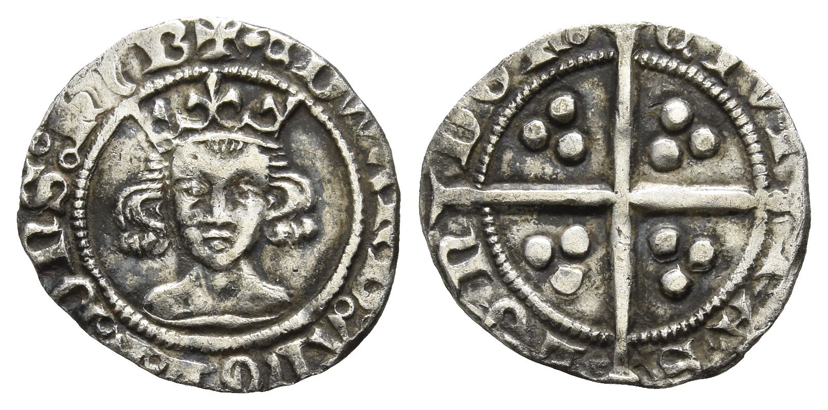 London mint; i.m: cross 3. Fourth Coinage, Treaty Period; struck 1361-1369. ✠ • ЄDWARD ◦◦ ANGL ◦◦ R ◦◦ DꞂS ◦◦ ҺУB, crowned facing bust / CIVI-TAS LOꞂ-DOꞂ ◦, long cross with three pellets in angles. North 1265; SCBC 1625. 1.16gr, 17mm, 10h.