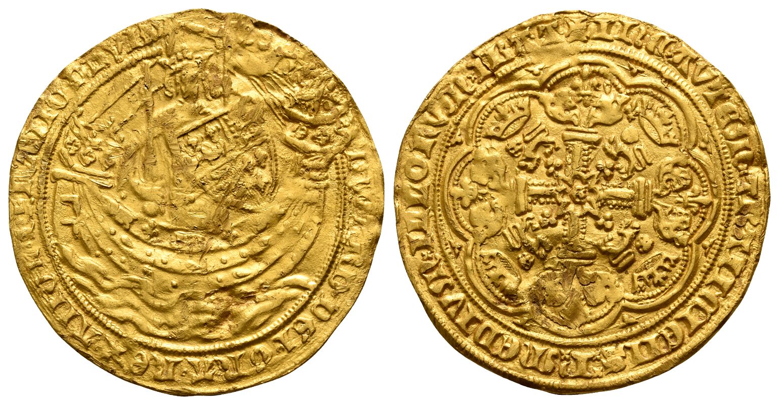 ЄDWARD ◦ DЄI ◦ GRA ◦ RЄX ◦ ANGL ◦ Z ◦ FRANC ◦ D ҺУB, King standing facing in ship, holding sword with left hand and shield bearing coat-of-arms with right; all within beaded border / ✠ IhC ˣ AVTЄᙏ ˣ TRANSIЄNS ˣˣ P ˣ ᙏЄDIVᙏ ˣ ILLORVᙏ ˣ IBAT, short cross potent over cross fleurée; voided angled polylobe containing Є at centre, lion passant guardant with crown above and trefoil below in each angle; all within polylobe, lis in each spandrel. Cf. North 1138; cf. SCBC 1484. 7.65gr, 34mm, 12h.