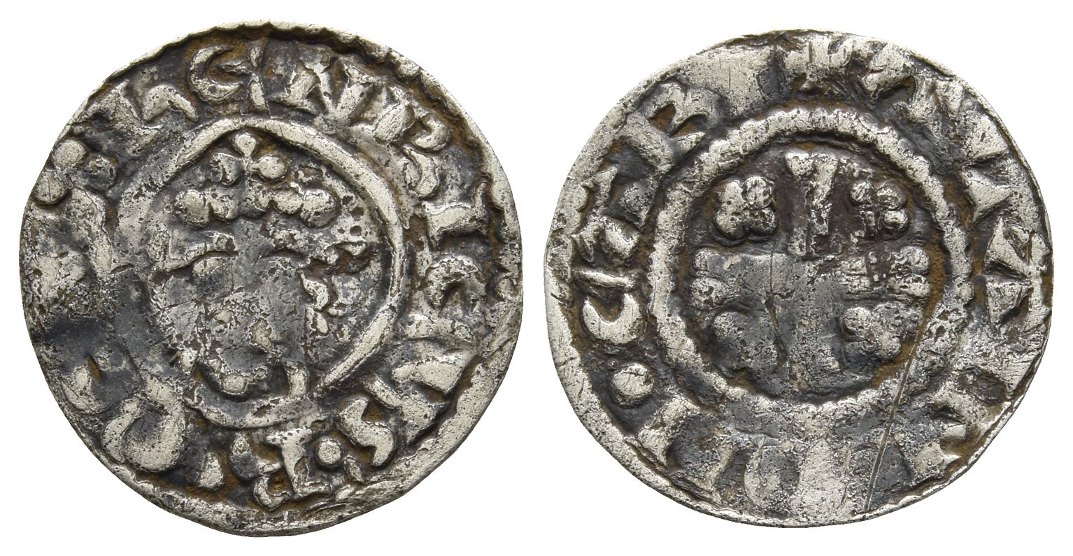 Carlisle mint. Short Cross type. Class 1b. ҺЄNRICVS • R-ЄX, facing crowned head holding cross-tipped sceptre to left / ✠ ALAIN ON • CAR, short voided cross, quatrefoils in each angle. North 963; SCBC 1344. 1.26gr, 20mm, 10h.
