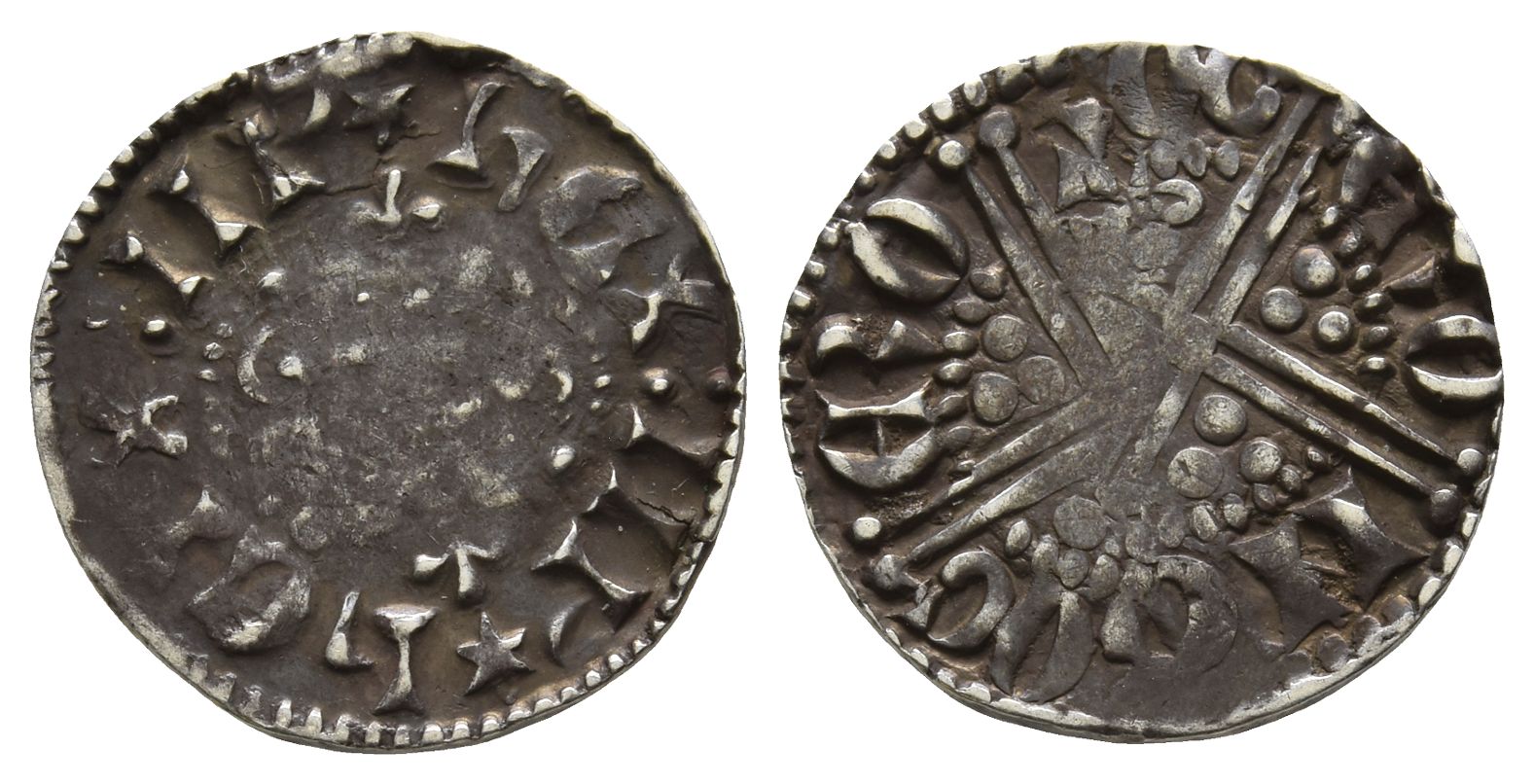 Gloucester(?) mint. Roger, moneyer. Class 3a1. hENRICVS REX III, crowned facing bust / ROGER ON [...], long cross, three pellets in each angle. Cf. SCBC 1362. 1.47gr, 18mm