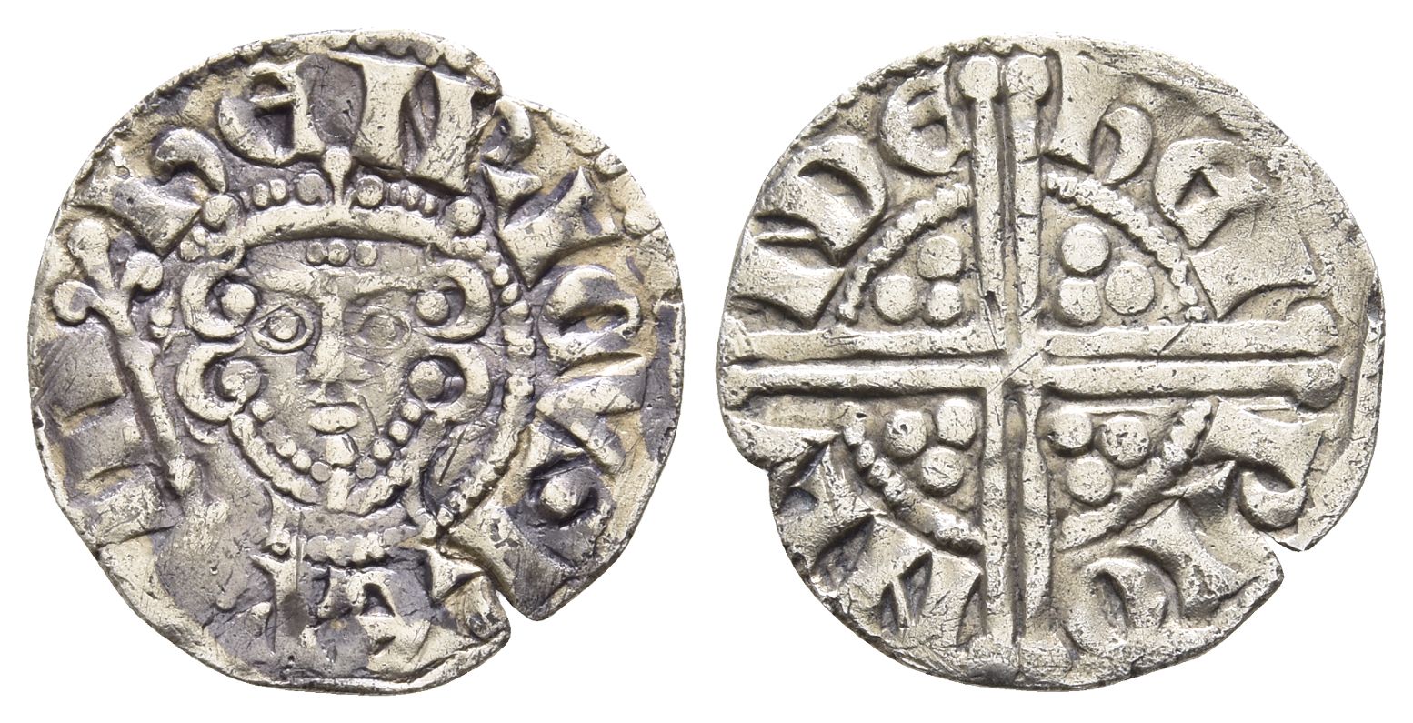 ҺЄHRICVS RЄX III, crowned facing head holding lis-tipped sceptre to left / ҺЄN-RI O-N LV-NDЄ, long voided cross with central pellet, quatrefoils in each angle. Cf. SCBC 1367A. 1.33gr, 18mm, 3h.