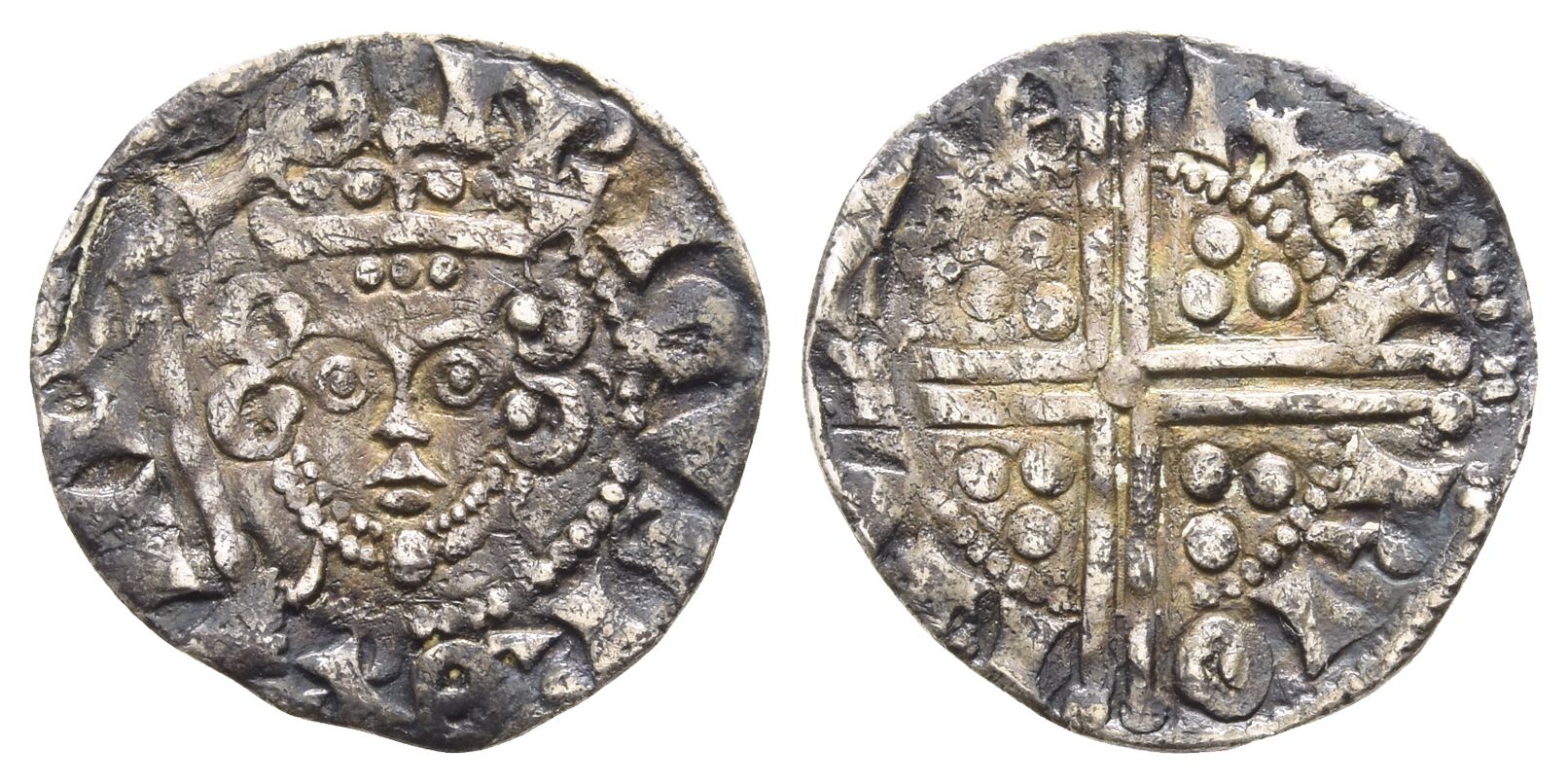 ҺЄNRICVS RЄX III, crowned facing head holding lis-tipped sceptre to left / ҺЄN-RI O-N LV-NDЄ, long voided cross with central pellet, quatrefoils in each angle. Cf. SCBC 1367A. 1.32gr, 18mm, 4h.