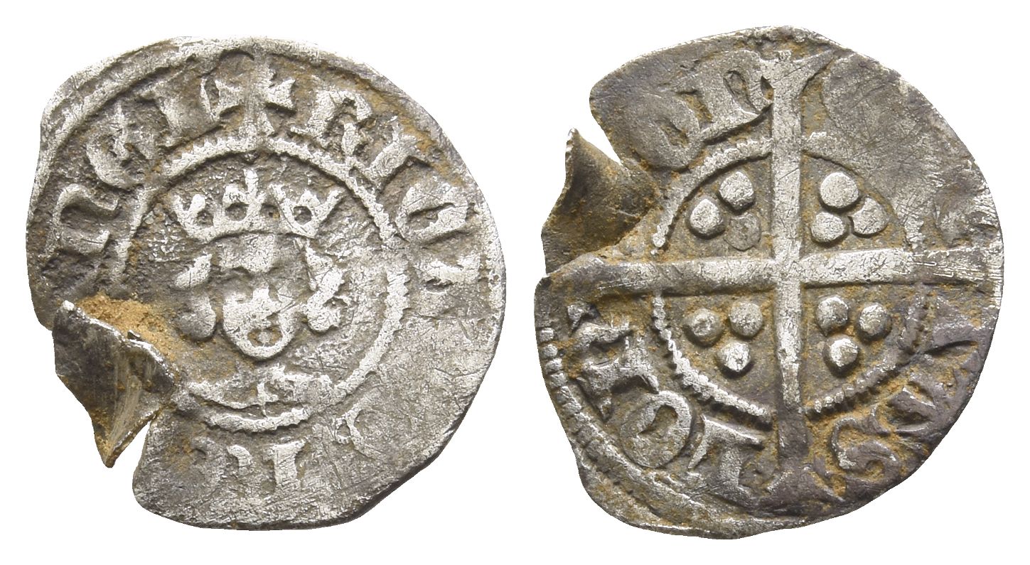 ✠ RICARD RЄX AꞂGL, crowned facing bust, saltire on breast / CIVI-TAS LOꞂ-DOꞂ, long cross pattée; triple pellets in quarters. Cf. North 1331a; cf. SCBC 1698. 0.60gr, 15mm, 6h.