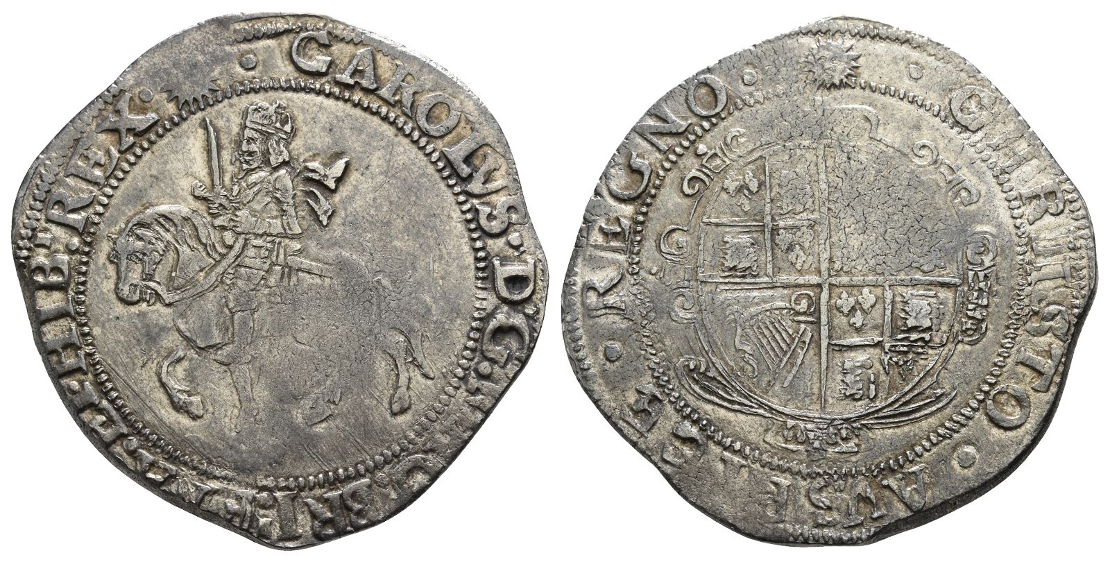 (Sun) • CAROLVS • D .' G .' MAG .' BRI .' FRA .' ET • HIB .' REX •, Charles on horseback to left, holding reigns and sword / (Sun) • CHRISTO • AVSPICE • REGNO •, coat-of-arms. SCBC 2779B. 15.06gr, 34mm, 6h.