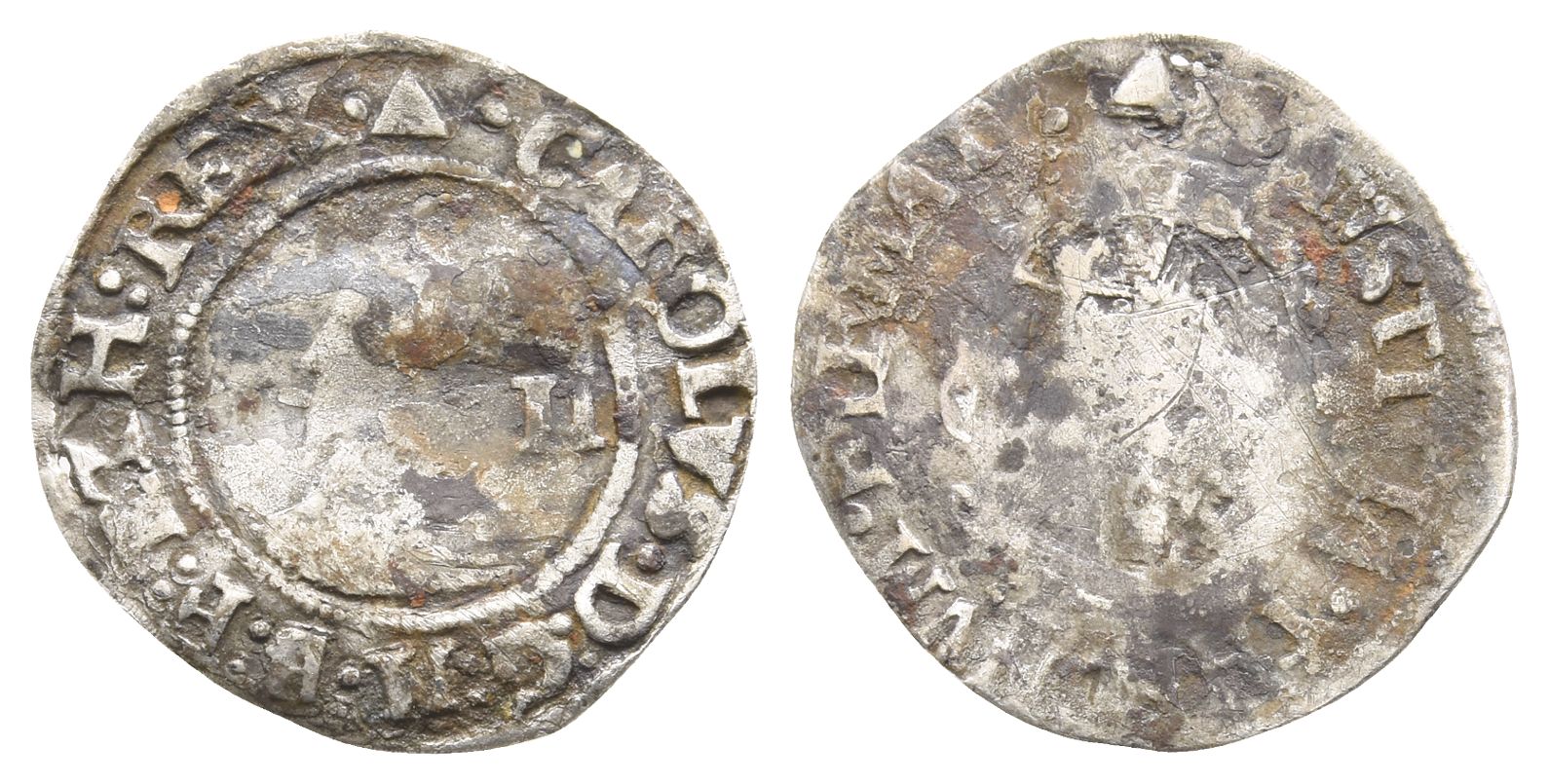 (Triangle) • CAROLVS • D : G : M : B : F : ET • HIB : REX •, crowned bust to left, II (mark of value) behind / (Triangle) • IVSTITIA • THRONVM • FIRMAT •, coat-of-arms. Cf. North 2258; cf. SCBC 2832. 0.77gr, 18mm, 4h.
