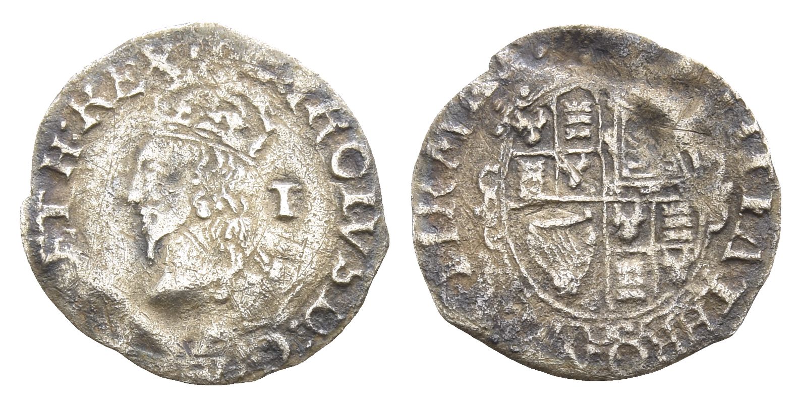 (Pellets) CAROLVS : D : G : M • B • F : ET H : REX fourth bust to left, crowned and mantled; I (mark of value) to right / IVSTITIA THRONVM FIRMAT, garnished coat-of-arms. North 2270; SCBC 2845. 0.34gr, 14mm, 4h.