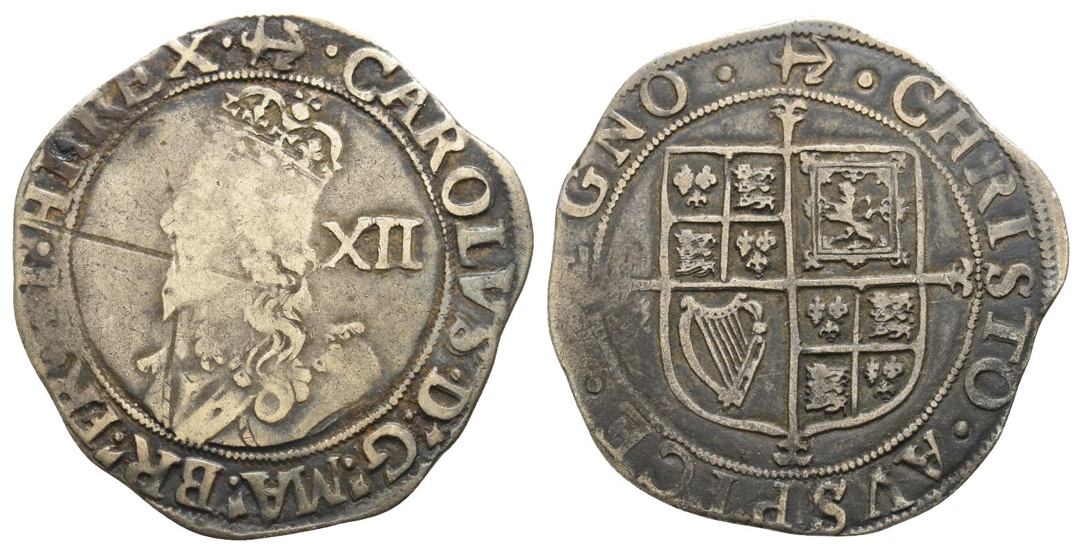 (Anchor) · CAROLVS · D ·' G ·' MA ·' BR ·' FR ·' ET · HI ·' REX ·, crowned bust to left; XII (mark of value) behind / (Anchor) · CHRISTO · AVSPICE · REGNO ·, coat-of-arms over cross moline. North 2230; SCBC 2795. 5.79gr, 31mm, 7h.