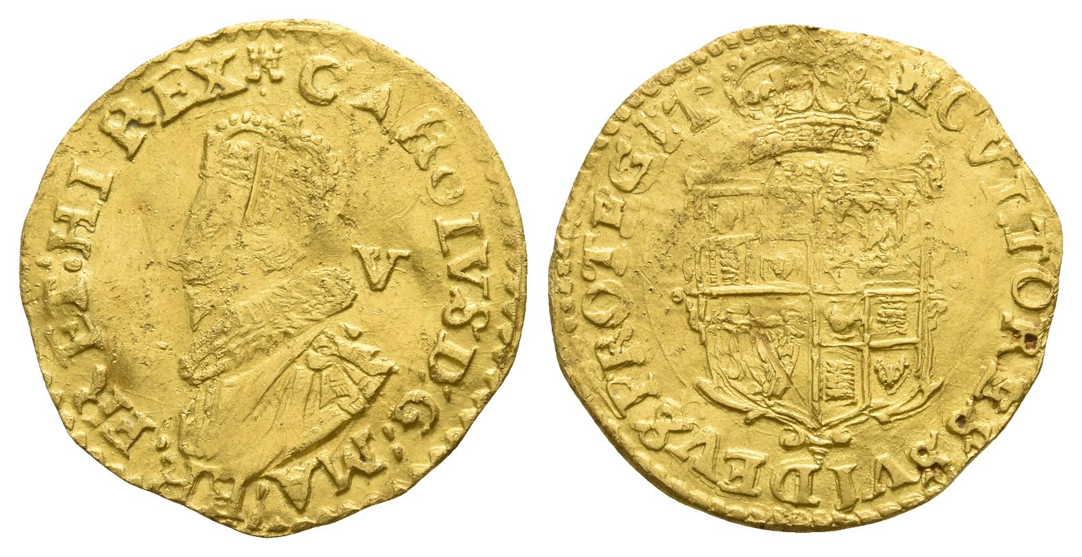 (Castle) CAROLVS D : G : MA : BR : FR ET HI REX, crowned and mantled bust 2 to left; V (mark of value) to right / (Castle) CVLTORES SVI DEVS PROTEGIT, crowned and garnished coat-of-arms. Schneider 228; North 2181; SCBC 2711. 2.25gr, 20mm, 3h.