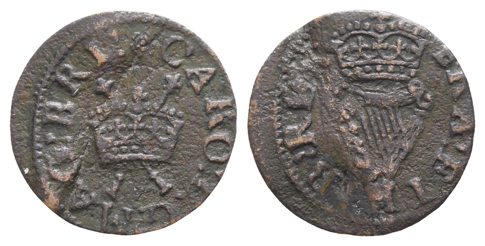 (Double rose) CARO : D : G .' MAG .' BRI .', crown over crossed lis-tipped sceptres / FRA .' ET HIB .' RE[X], crowned scroll-headed harp. SCBC 3186. 0.51gr, 17mm, 6h.