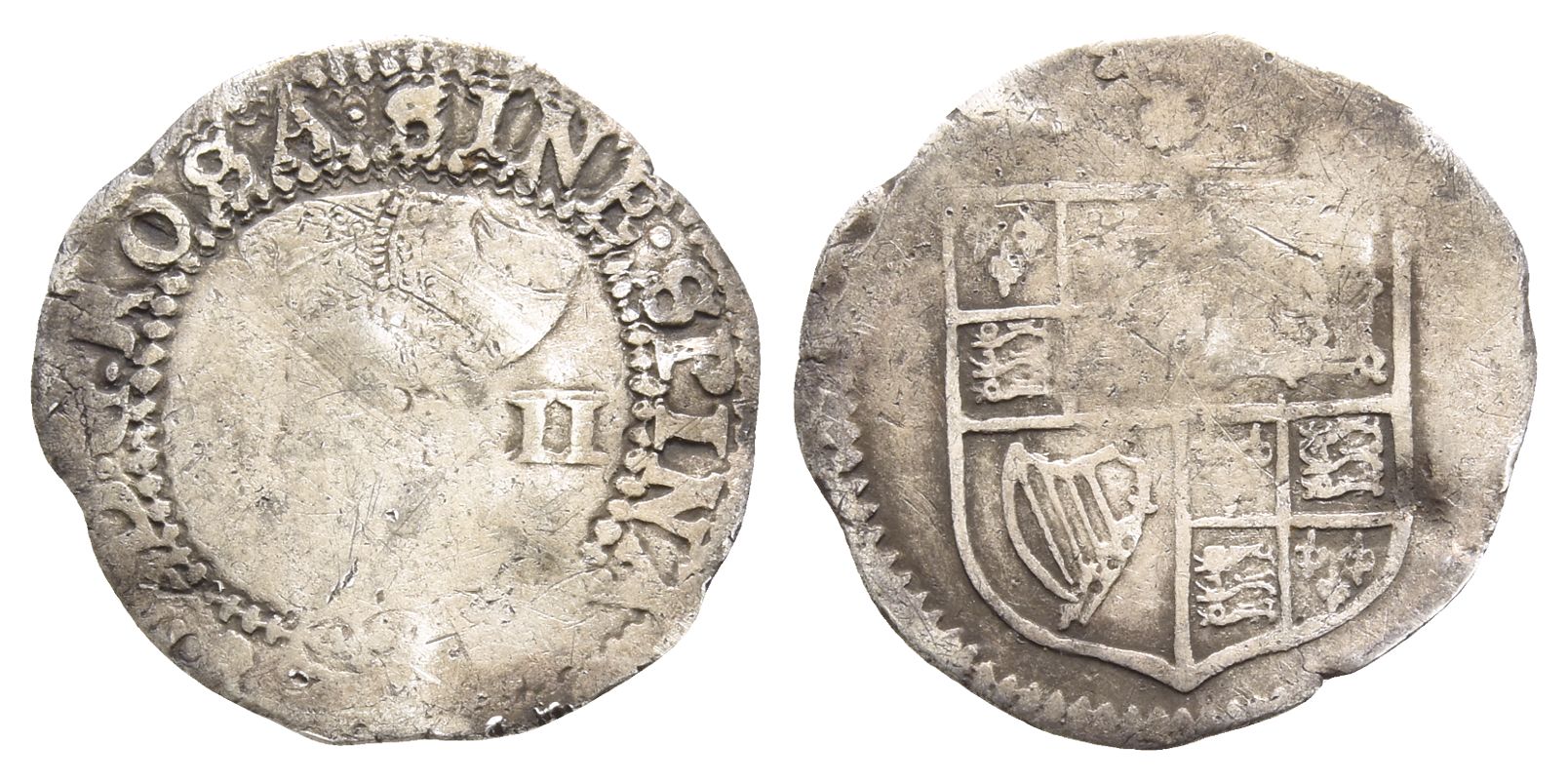 I: D : G : ROSA • SINE • SPINA, crowned first bust to right; II (mark of value) to left / Coat-of-arms, (Thistle) above. North 2076; SCBC 2649. 0.94gr, 18mm, 12h.