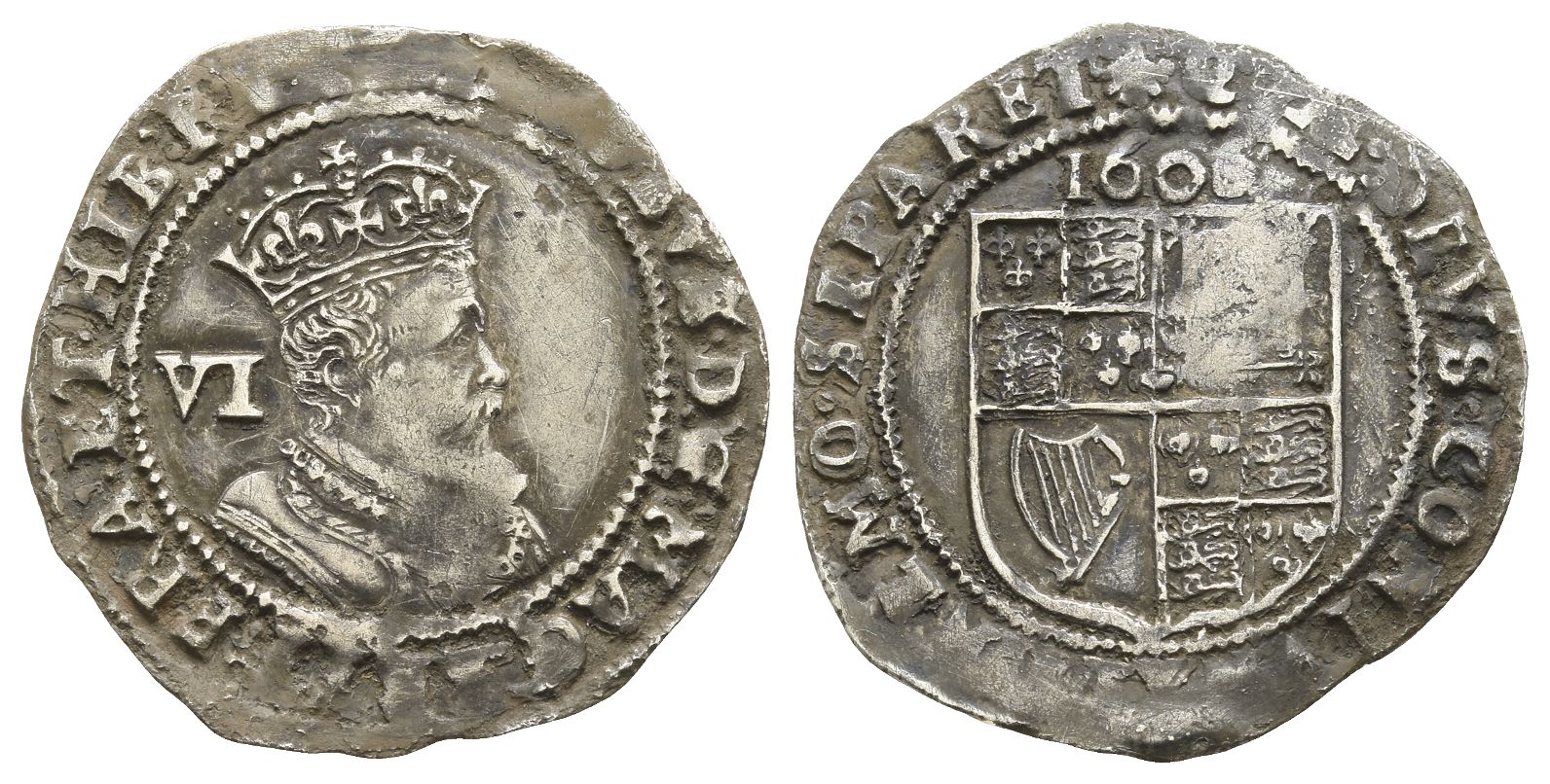 [(Escallop) IACO]BVS • D .' G .' MAG .' BRIT .' FRA .' ET • HIB .' R[EX], crowned fourth bust to right; VI (mark of value) to left / (Escallop) • QVÆ • DEVS • CONIVNXIT • NEMO • SEPARET •, coat-of-arms; date above. North 2103; SCBC 2658. 2.85gr, 26mm, 5h.