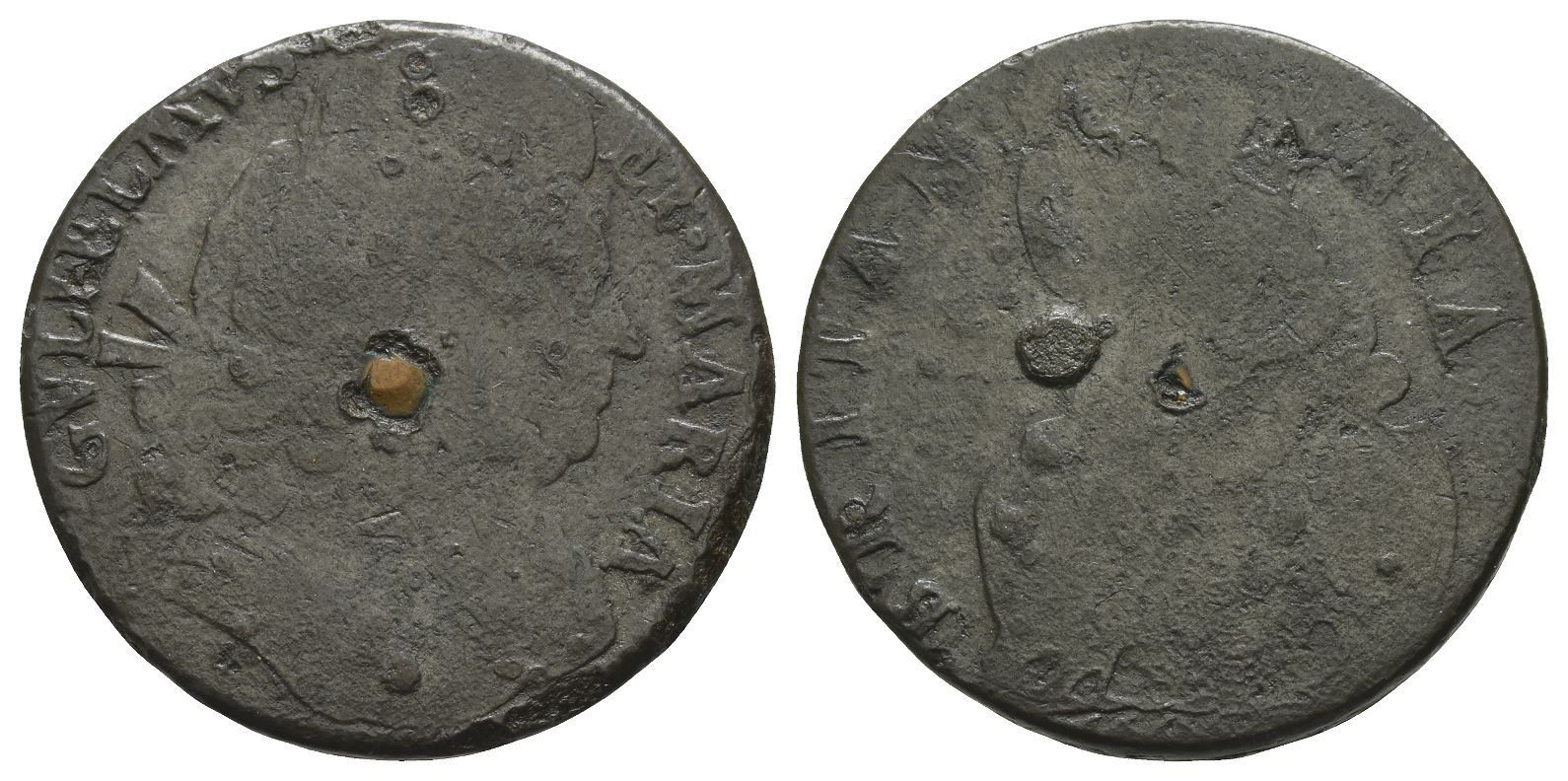 Type 1. GVLIELMVS ET MARIA, copper plug at centre, conjoined laureate and draped busts to right / BRITANNIA, Britannia seated on globe with spear, shield and spray of leaves, date below in exergue. Edge inscription: NVMMORVM++FAMVLVS.1691++. Peck 583 ER; SCBC 3451. 10.89gr, 28mm, 6h