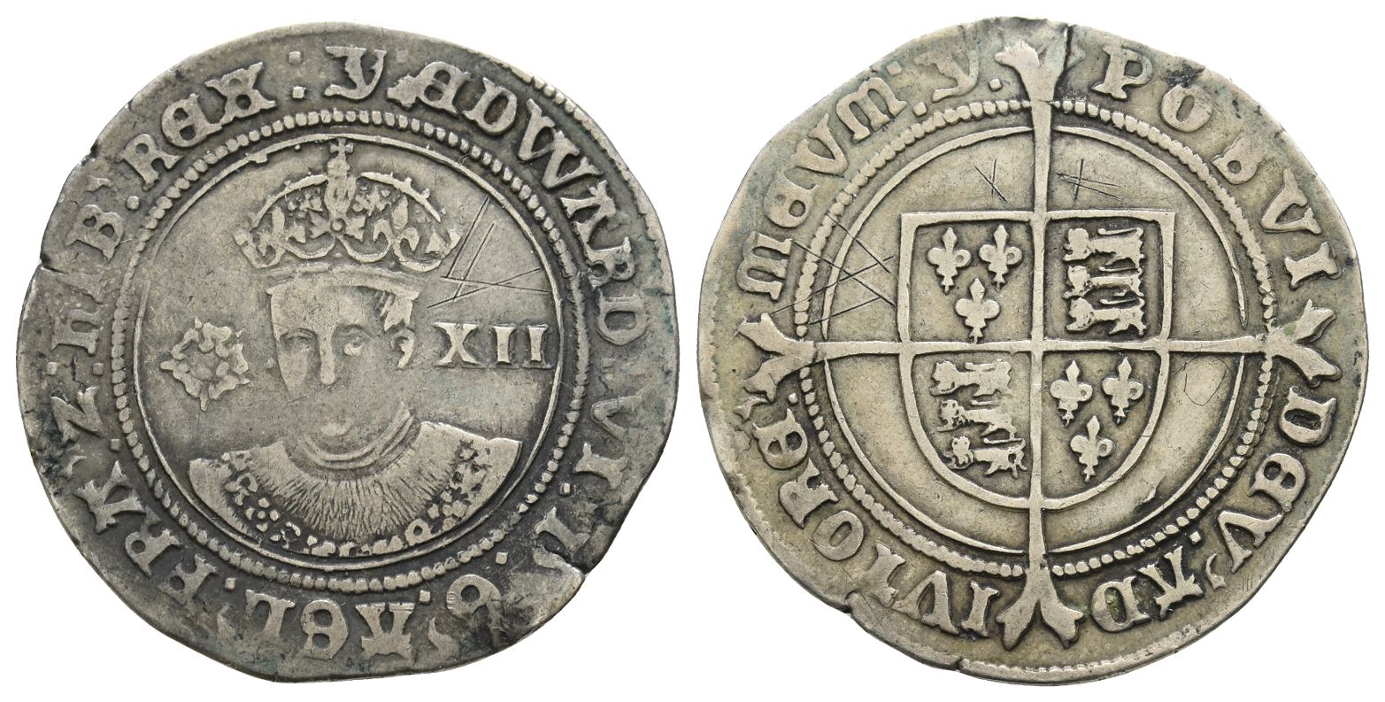(y) : ЄDWARD .' VI : D .' G .' AGL .' FRA .' Z : ҺIB .' RЄX :, crowned and mantled bust facing slightly to left; rose to left, XII (mark of value) to right / (y) POSVI DЄV .' A-DIVTOR-Є .' ᙏЄVᙏ : (y)., coat-of-arms over long cross fourchée. North 1937; SCBC 2482. 5.93gr, 32mm, 8h.