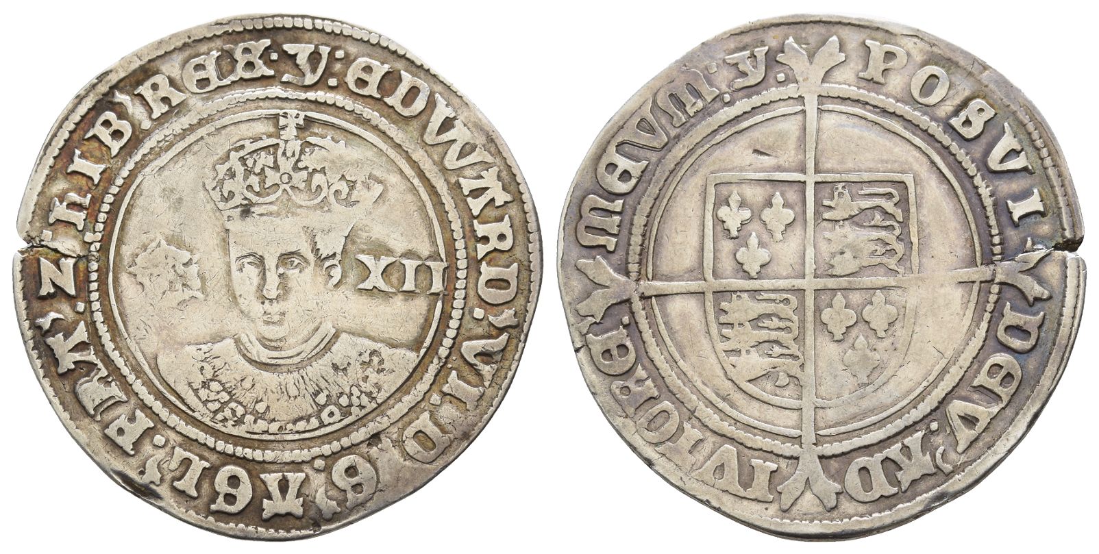 (y) : ЄDWARD .' •VI : D .' •G .' AGL ': FRA .' Z : ҺIB .' RЄX, crowned and mantled bust facing slightly to left; rose to left, XII (mark of value) to right / (y) POSVI DЄV .' A-DIVTOR-Є .' ᙏЄV .', coat-of-arms over long cross fourchée. North 1937; SCBC 2482. 6.01gr, 33mm, 12h.