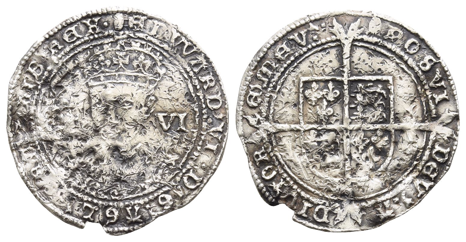 EDWARDVS VI D G AGL FRA Z HIB REX, facing bust with rose left and VI right with tun mintmark./ POSVI DEVM ADIVTORE MEV, long cross over shield of arms. Cf. North 1938, SCBC 2483. 2.95gr, 27mm, 10h.