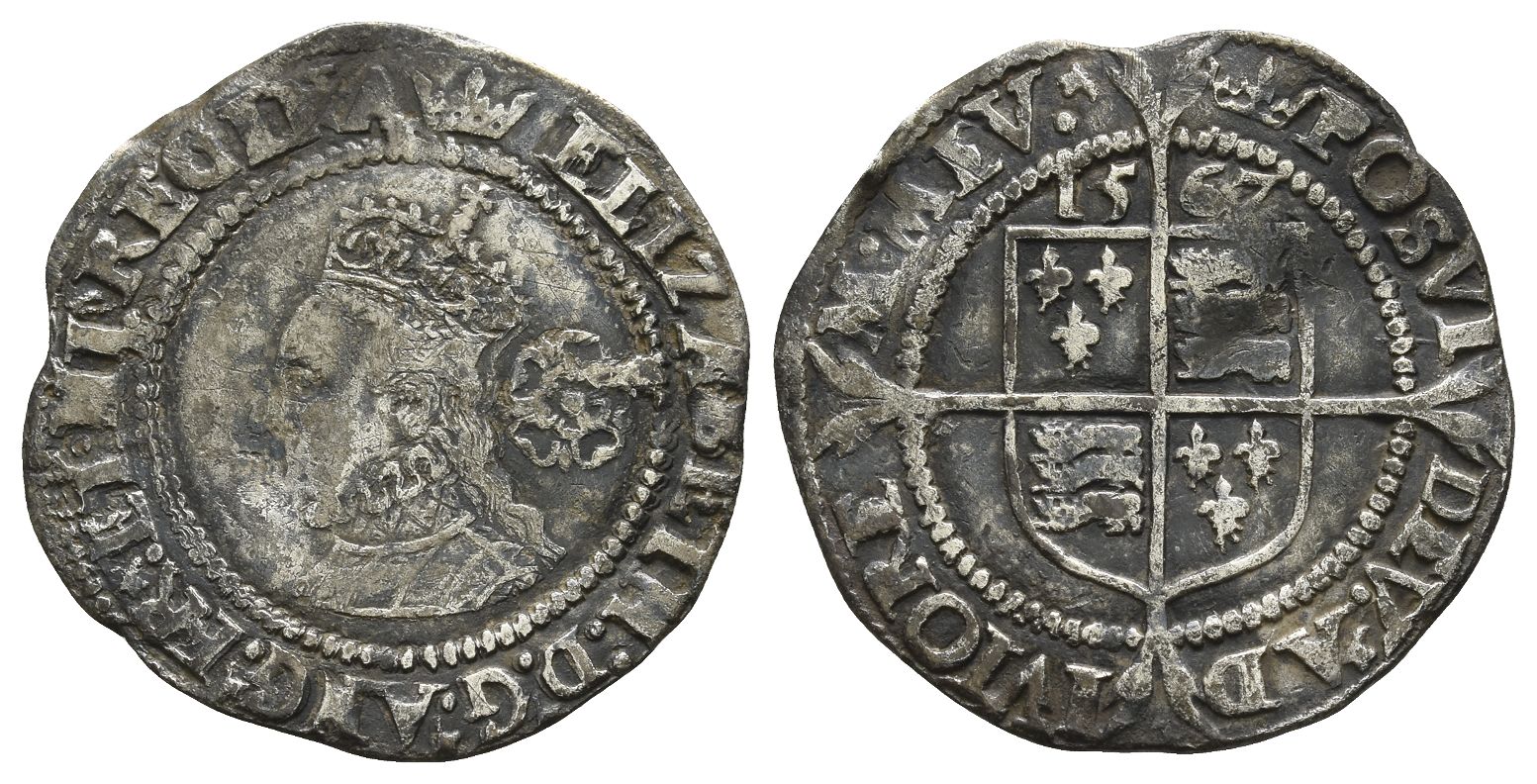 Tower (London) mint; i.m: coronet. Dated 1567. Third and Fourth Issues. (Coronet) ELIZAB : D .' G .' ANG .' FR .' ET : HI .' REGINA, crowned bust to left, wearing ruff; rose behind / (Coronet) POSVI DEV .' AD-IVTORE-M • MEV .', coat-of-arms over cross fourchée; date above. North 1997; SCBC 2562. 2.90gr, 26mm, 3h.