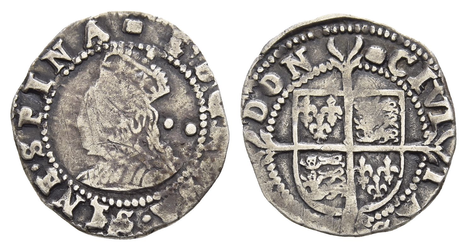 (Tun) • E .' D .' G .' ROSA • SINE • SPINA •, crowned bust to left, wearing ruff; •• (mark of value) behind / (Tun) : CIVI-TAS LON-DON, coat-of-arms over long cross fourchée. SCBC 2579. 0.96gr, 16mm, 2h.
