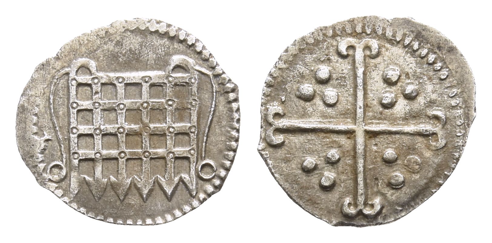 Portcullis / Cross moline; triple pellets in quarters. North 2018; SCBC 2581. 0.23gr, 11mm, 1h.